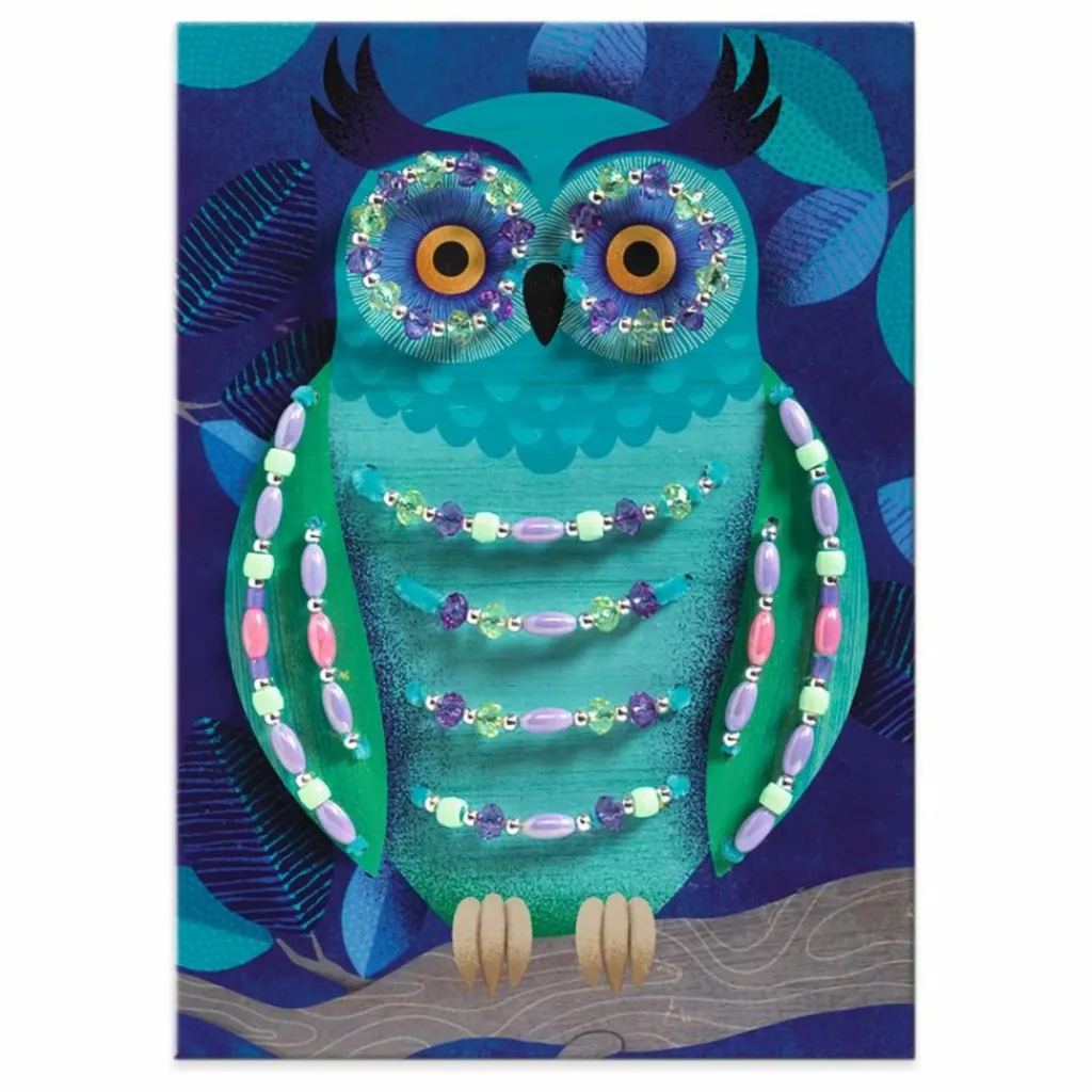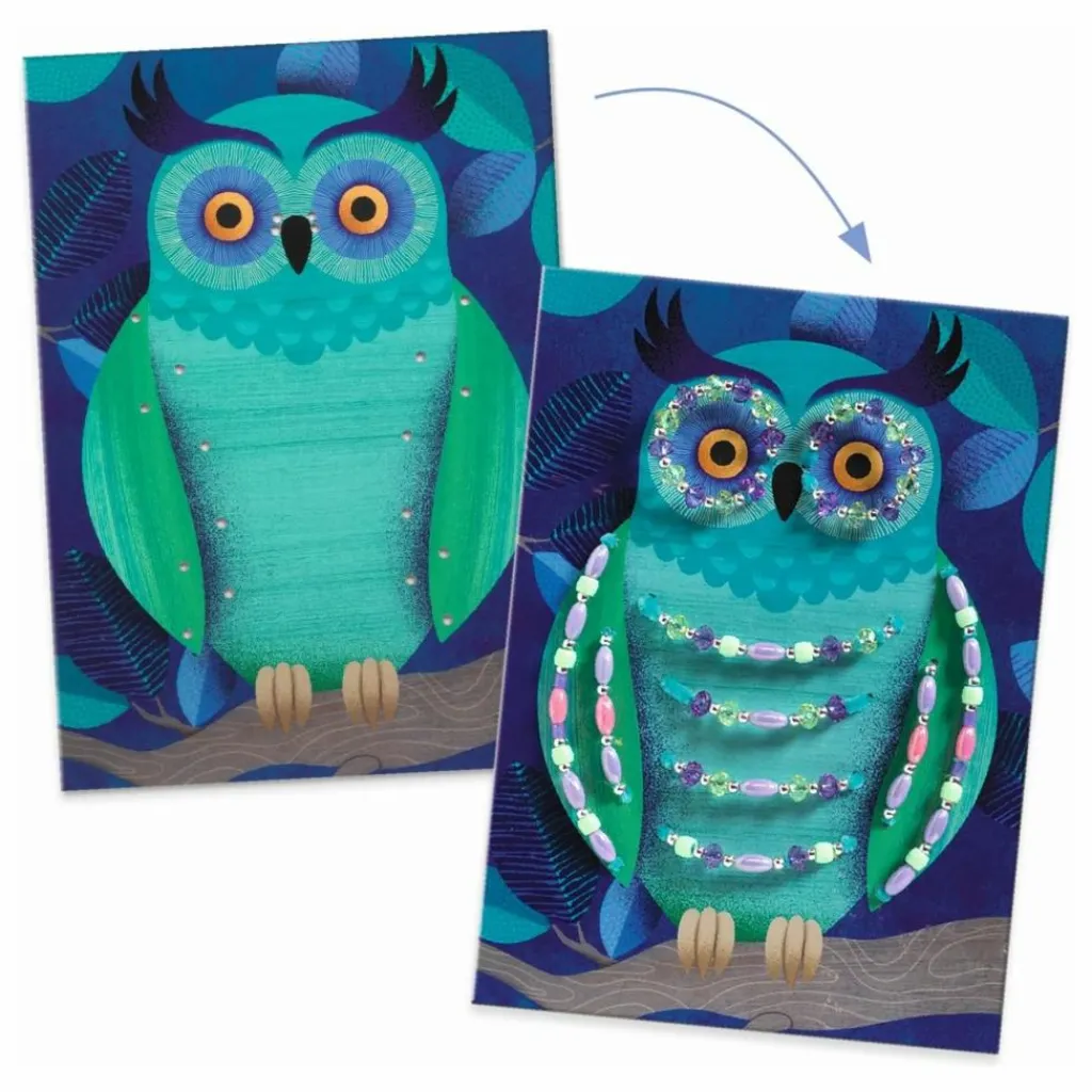- On enfile les perles sur les fils chenilles, en suivant les modèles du livret. On les insère ensuite dans les planches : les illustrations s’illuminent et se mettent en relief.