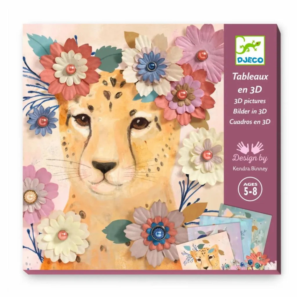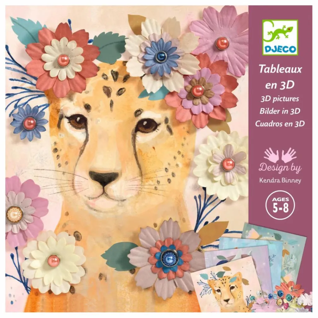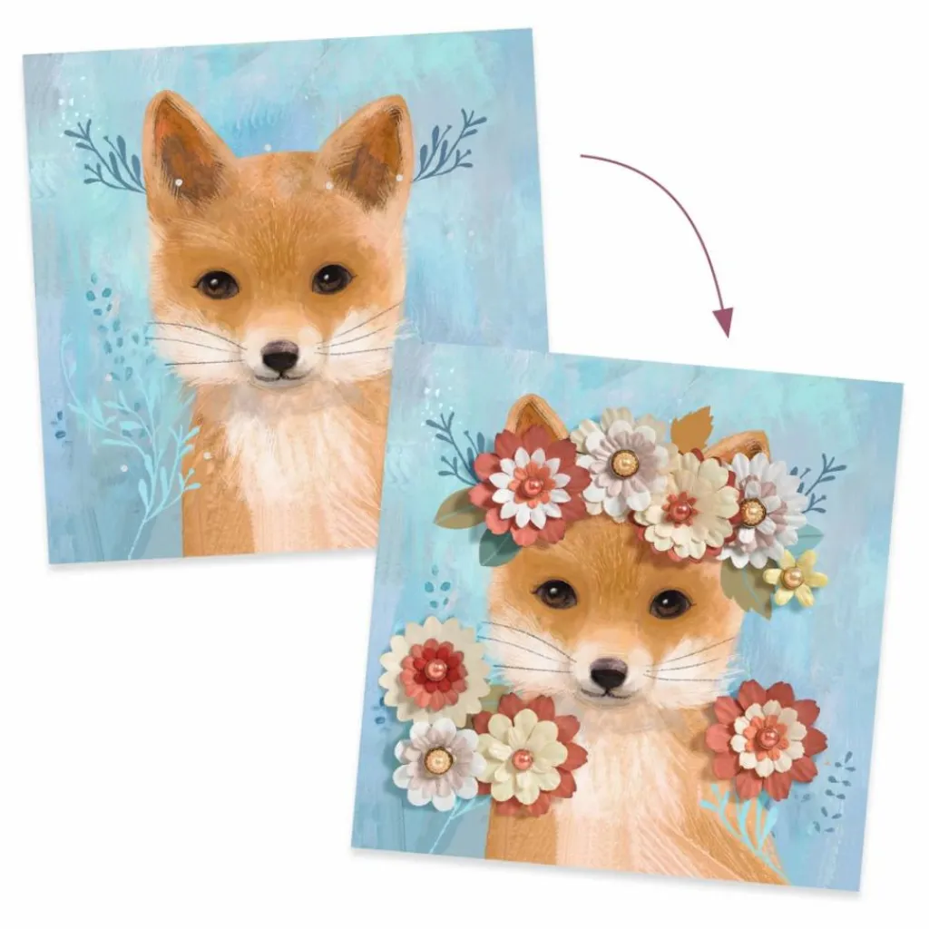 Pour compléter les 4 tableaux, l’enfant dispose d’une multitude de corolles de papier, qu’il assemble facilement grâce aux jolies attaches parisiennes nacrées. De magnifiques couronnes de fleurs coiffent la tête des animaux.