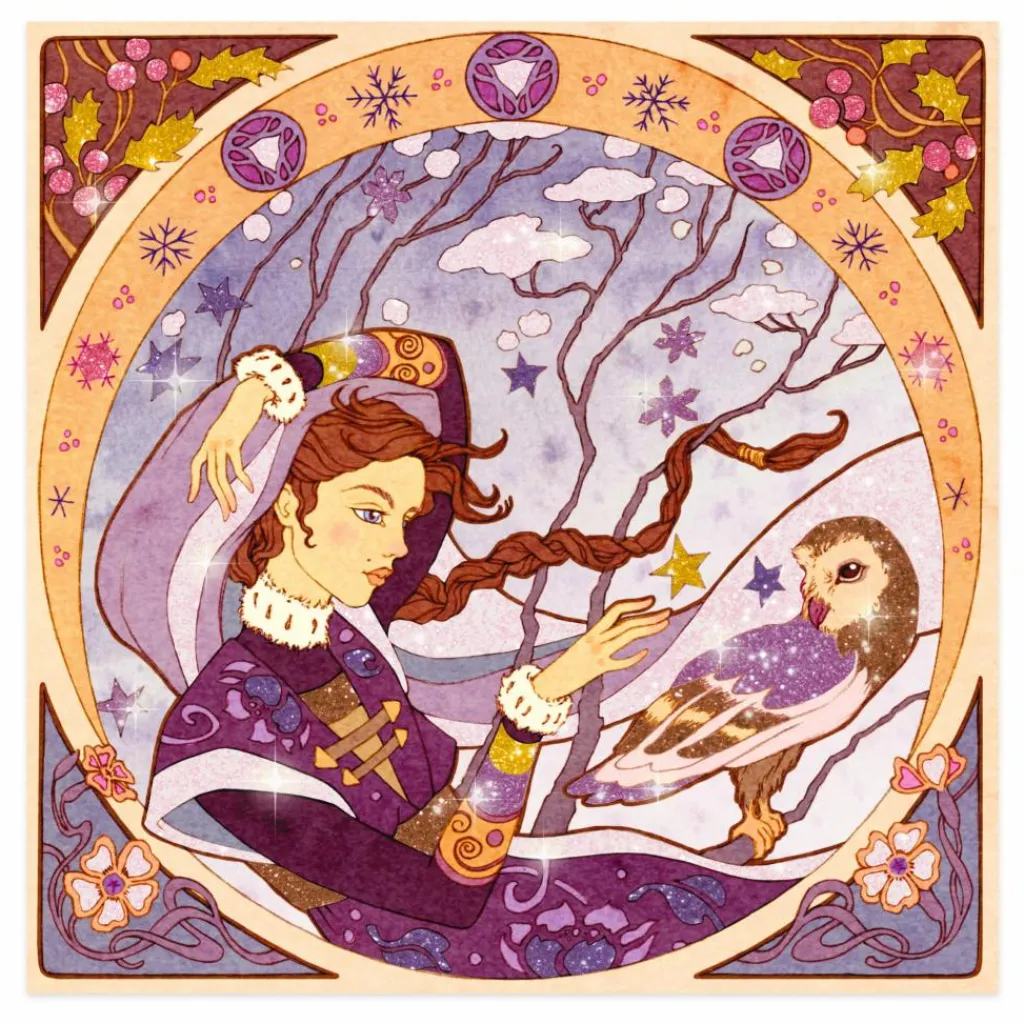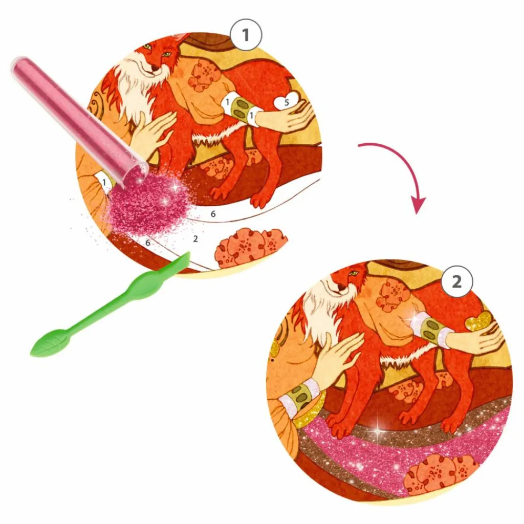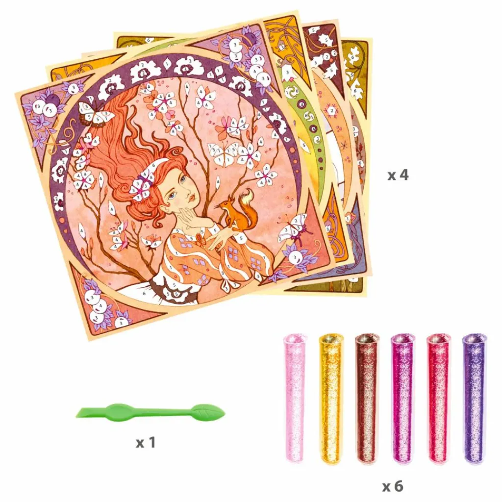 Une activité de tableaux à pailleter aux illustrations inspirées du style du grand maître de l’Art Nouveau, Alfons Mucha. Votre enfant place son tableau dans la boîte, il dévoile les zones préencollées grâce à l’outil fourni, puis les saupoudre de poudre pailletée en suivant le code couleur indiqué dans le livret. Les jeunes femmes prennent vie dans leur décor végétal.