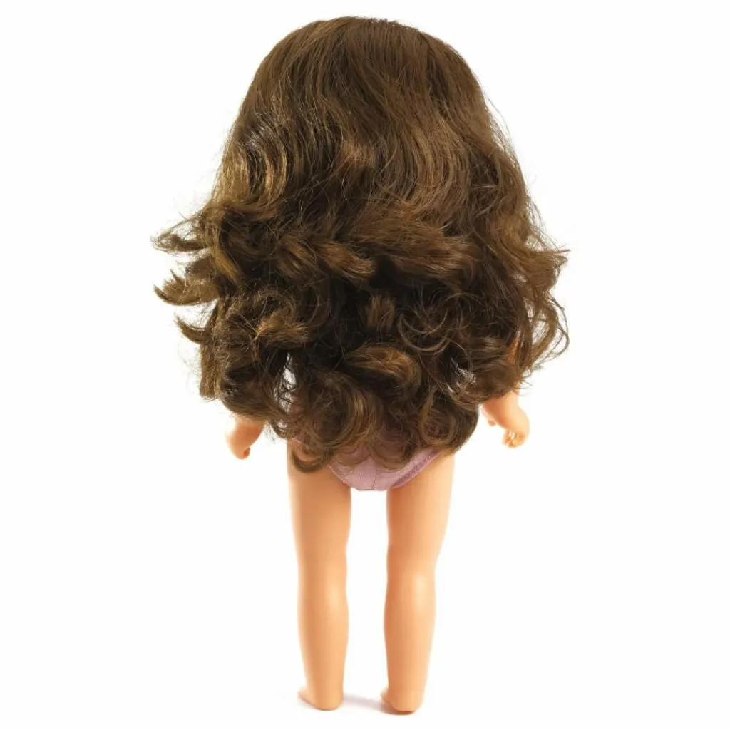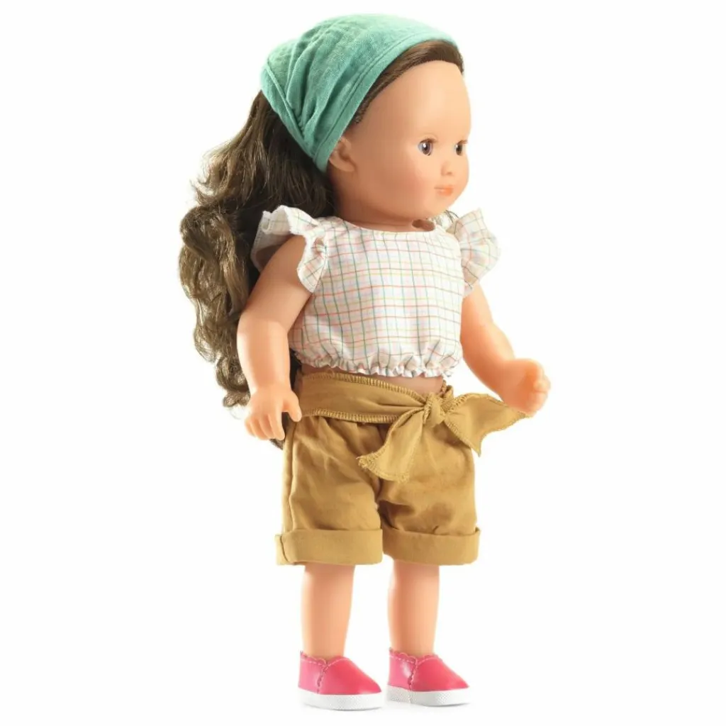 - 1 poupée fille vinyle de 32 cm, cheveux longs ondulés, 1 haut sans manche, 1 short, 1 culotte, 1 bandeau foulard et des chaussures.