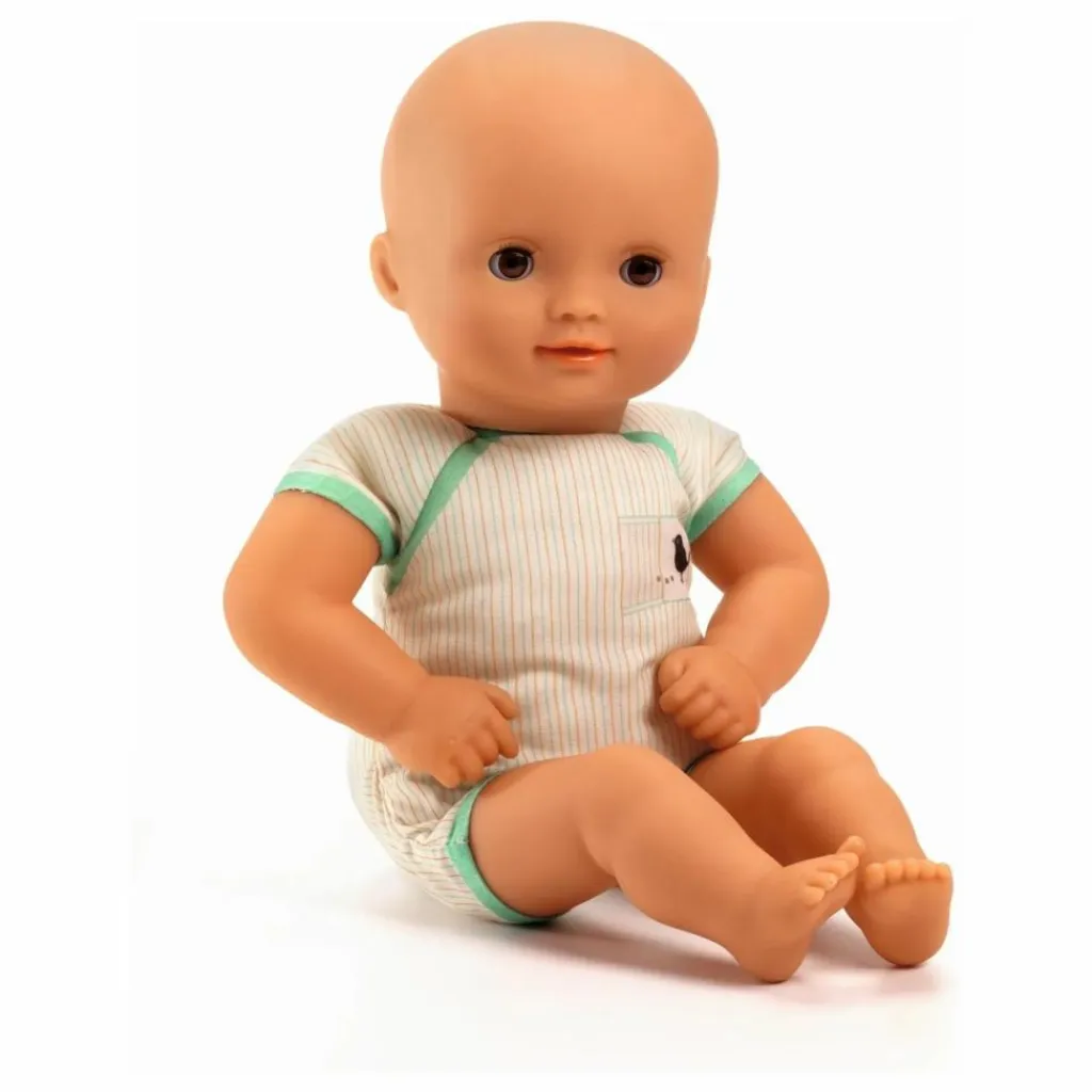 - 1 poupée de 32 cm (corps souple en tissu et tête, bras et jambes en vinyle), 1 barboteuse, 1 béguin.