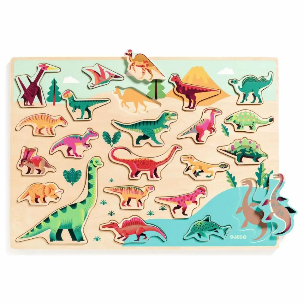 - Un puzzle en bois sur le thème des dinosaures. L’enfant place les 22 pièces en reconnaissant sur le plateau les silhouettes des dinosaures.