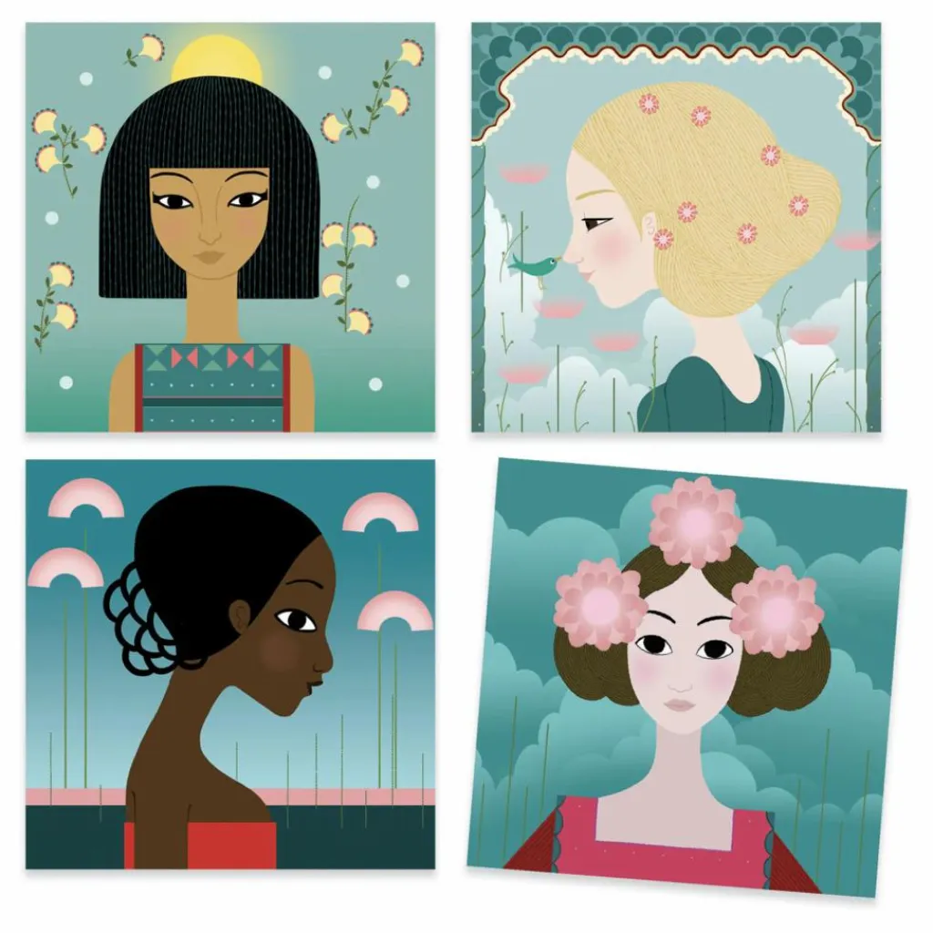 - 4 tableaux à compléter, 1 planche de tampons souples et transparents, 1 bloc de positionnement transparent en acrylique, 1 tapis nettoyeur, 4 encreurs (blanc, vert, rouge, or), 1 livret d’explications pas à pas en couleurs.