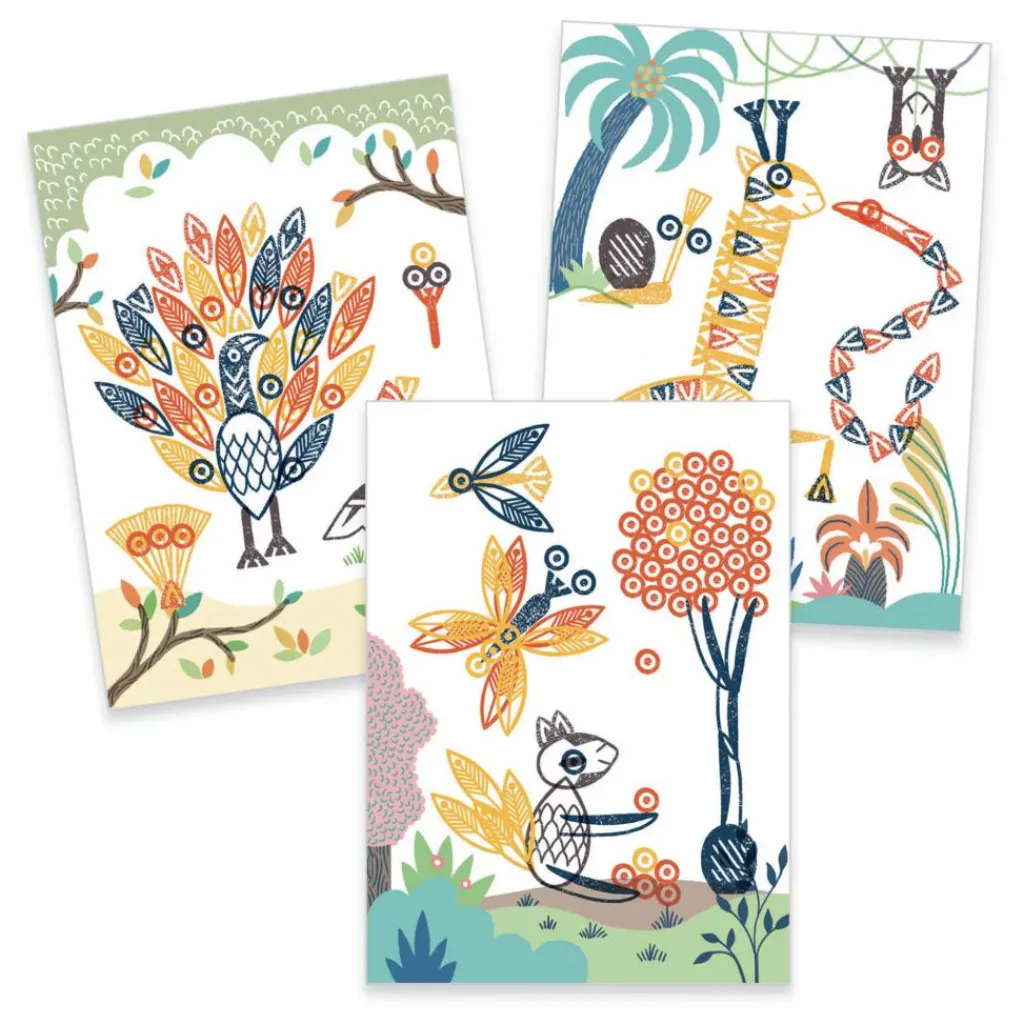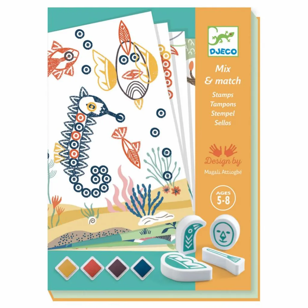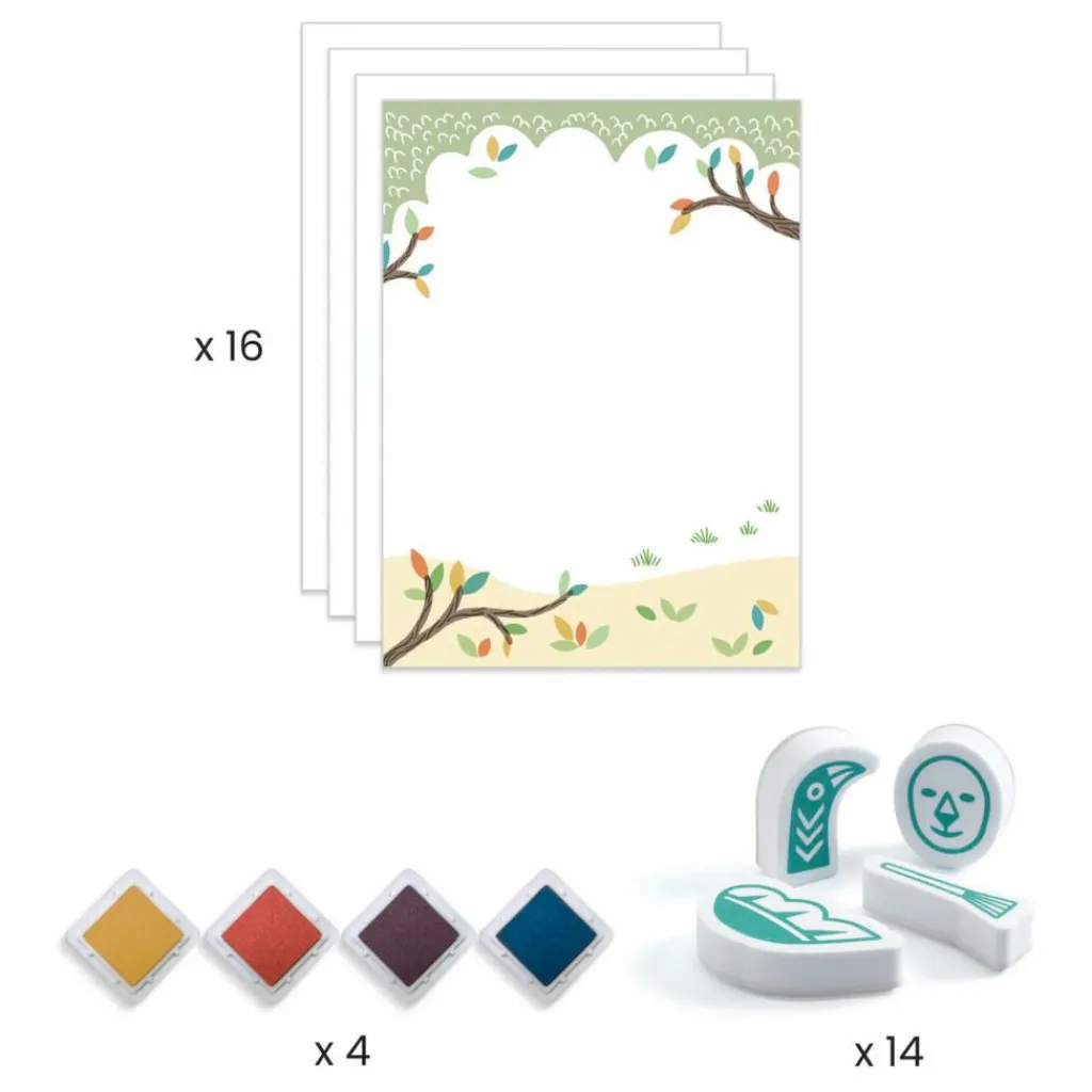 - 16 cartes à compléter, 14 tampons, 4 encreurs (marine, jaune, vermillon, taupe), 1 livret d’explications pas à pas en couleurs.