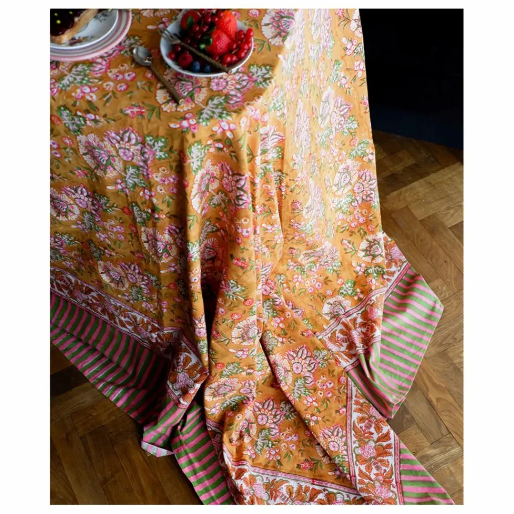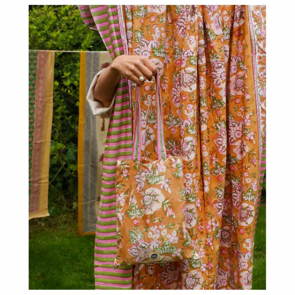 - Cette nappe, imprimée à la main, s’accompagne d’un joli sac fourre-tout assorti.