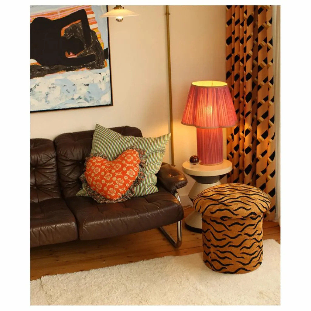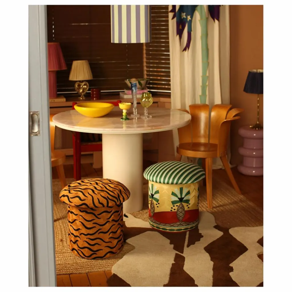 - Le tabouret brodé Maya Tiger est un objet qui fera sensation dans votre intérieur. Cette pièce étonnante, qui mesure 46 x 48 x 48 cm et pèse 4,4 kg, est méticuleusement fabriquée à la main par nos artisans qualifiés en Inde. Combinant laine et coton, le tabouret présente un motif de tigre saisissant, brodé pour ajouter une touche unique et artistique à votre décor. Parfait comme siège d’appoint, comme repose-pieds ou simplement comme élément décoratif, ce tabouret est à la fois fonctionnel et visuellement captivant.