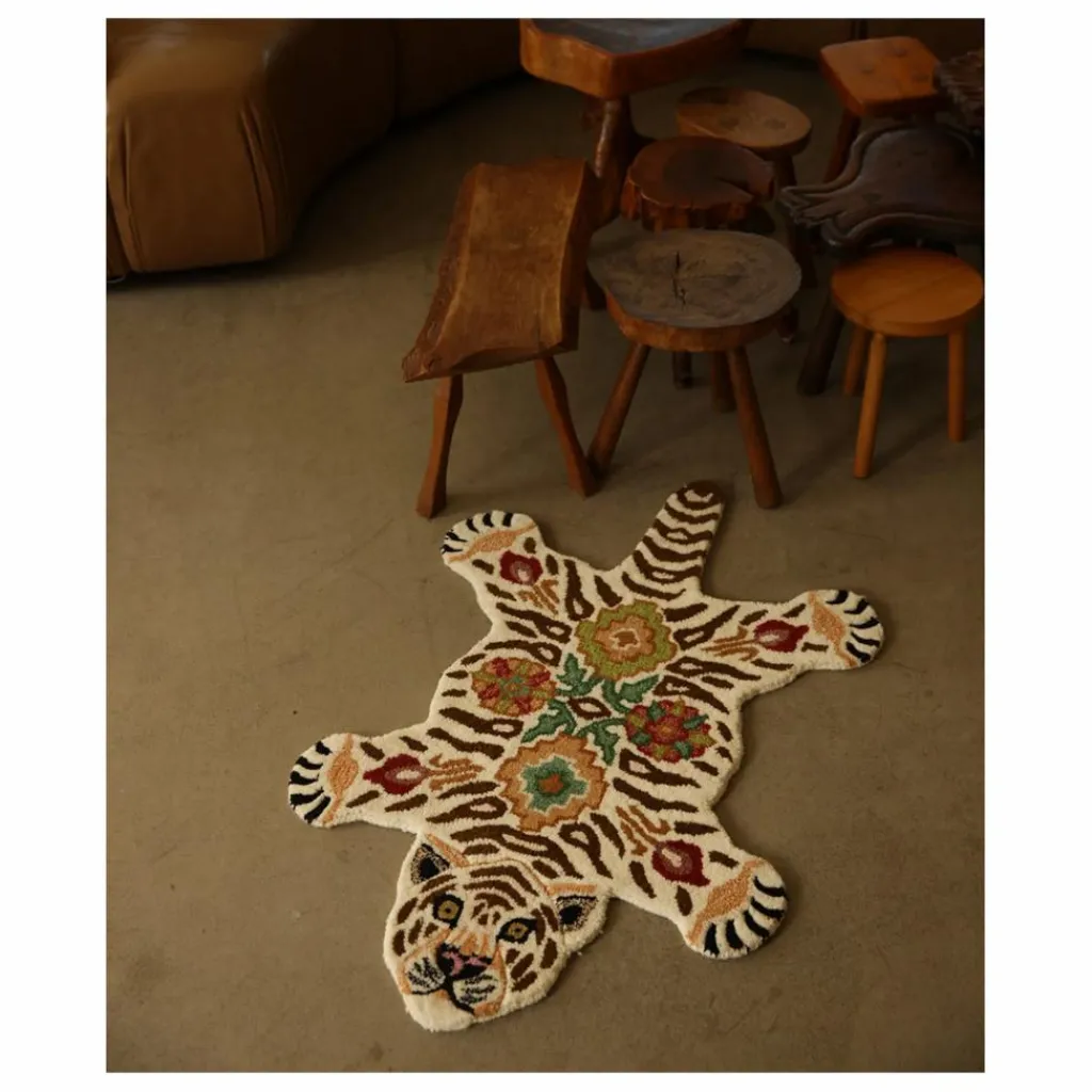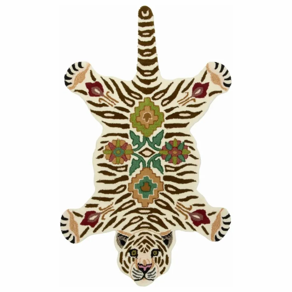 - Inspiré par l’une des plus grandes artistes féminines de tous les temps, Frida Kahlo, ce tapis tufté à la main présente un tigre blanc royal orné d’une couronne florale. De taille généreuse,