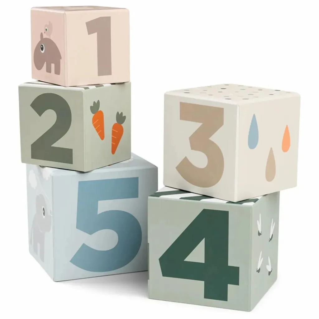 - • 5 cubes à empiler de 7×7 cm à 13×13 cm dans un mélange de couleurs douces