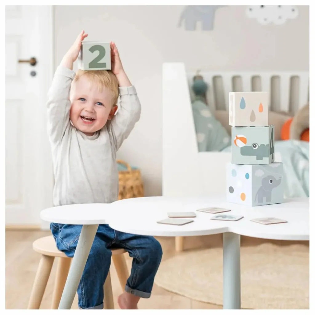 • Votre enfant pourra empiler les cubes pour ensuite les faire dégringoler et cacher des petits trucs dedans
