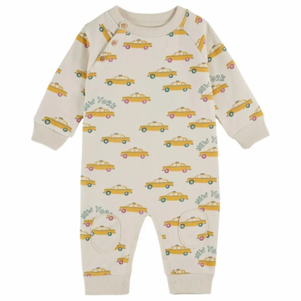 - Combinaison en jersey de coton biologique molletonné et gratté écru sur lequel circulent des taxis New Yorkais, jaunes.