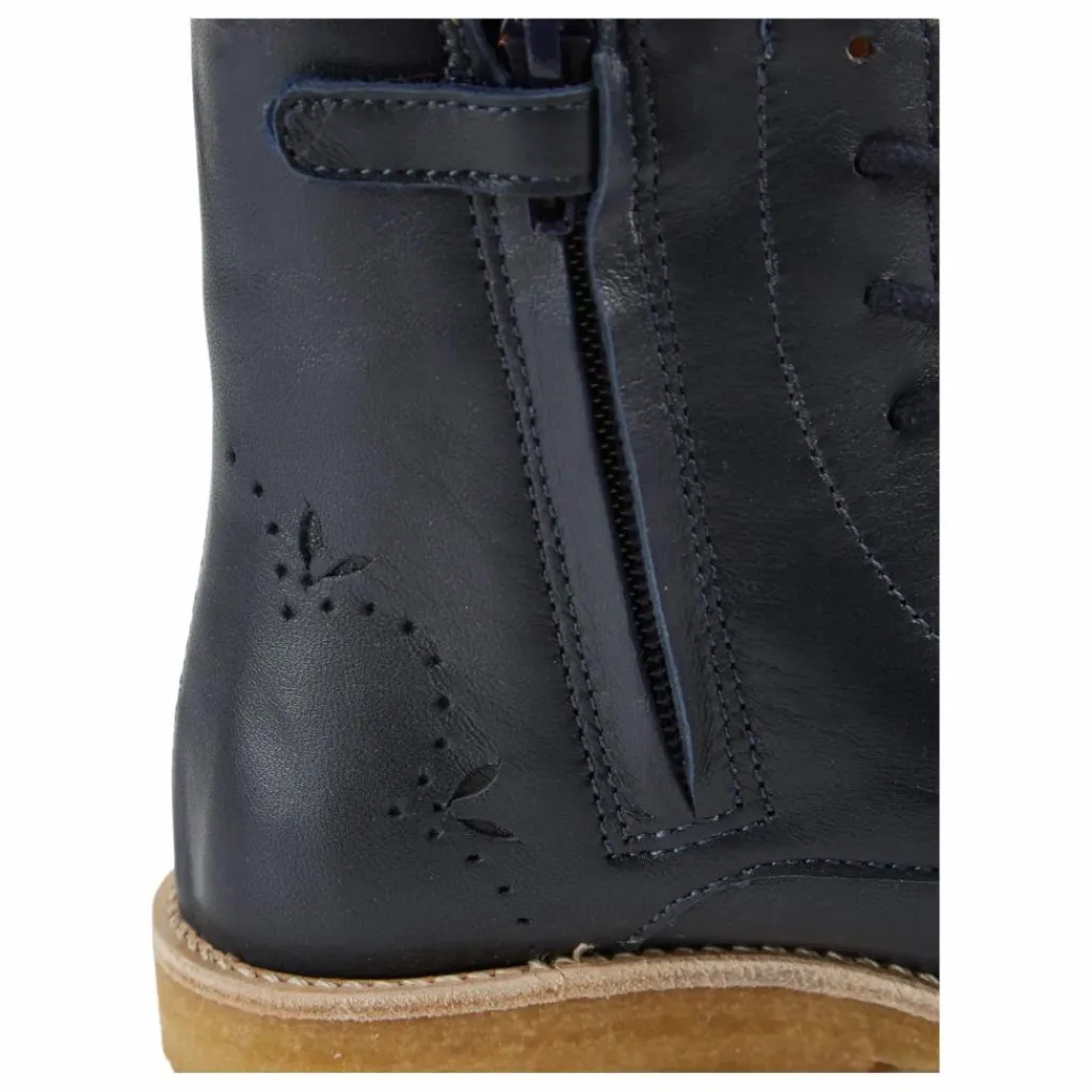 - Bottines lacées en cuir bleu marine. Lacées pour le confort des chevilles, ces chaussures sont dotées d’une fermeture à glissière sur le côté interne de la tige et d’une tirette à l’arrière qui facilite l’enfilage. Elles sont entièrement doublées de cuir et les semelles en crêpe évitent les glissades intempestives et les dérapages incontrôlés.