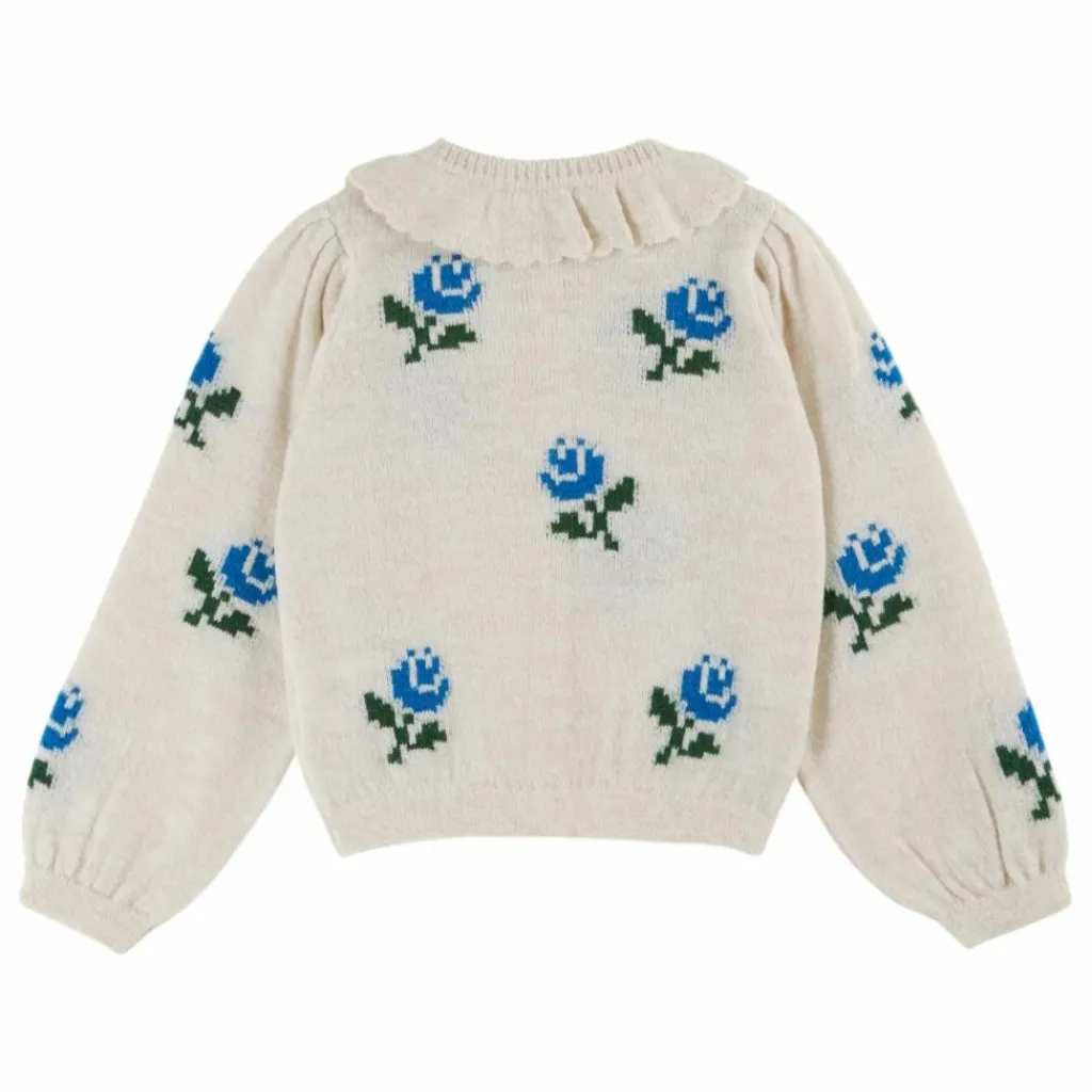- Cardigan en laine mohair écru parsemé de grosses roses bleues.