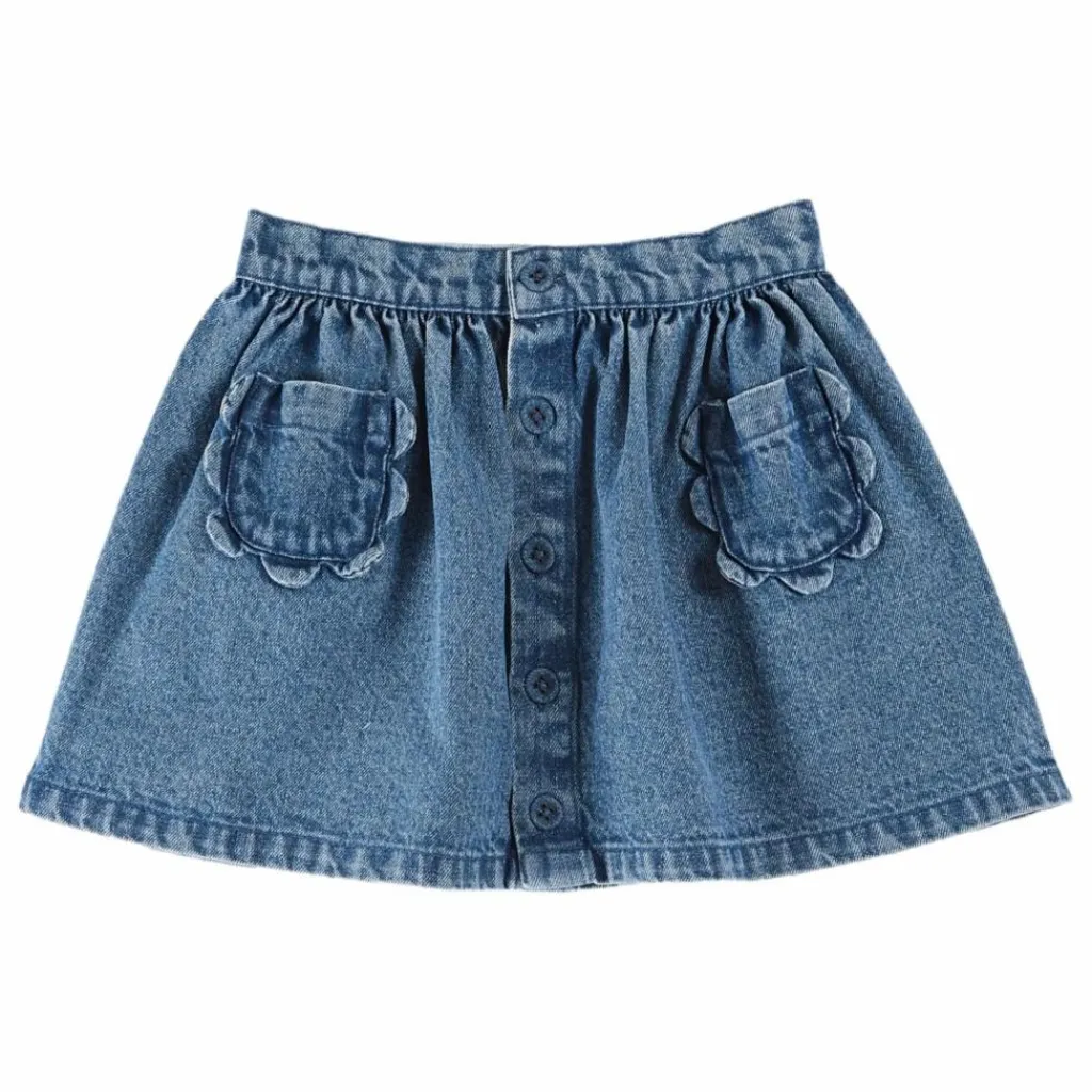 - Mini jupe en toile de coton denim bleue. Elle est montée sur une ceinture dans laquelle est glissé un élastique à bouton pour s’ajuster à toutes les tailles. Les deux panneaux de devant, froncés, se ferment avec des boutons recouverts de tissu et accueillent chacun une ravissante poche-fleur plaquée pour mettre ses mains au chaud ou pour dissimuler ses petits trésors.