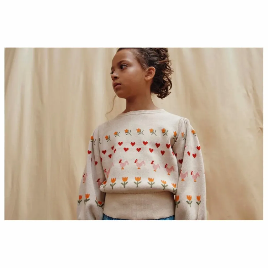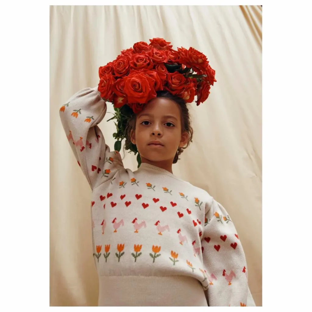- Pull jacquard intarsia en coton biologique rose, orné d’une ligne de poules écrues encadrée de fleurs et de cœurs rouges. Le point fantaisie dans lequel le pull est tricoté apporte une texture différente du graphisme du point de jersey, tandis que la technique du jacquard intarsia ajoute de l’épaisseur à la pièce.