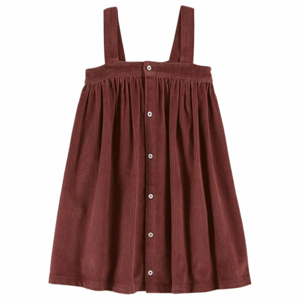 - Robe à bretelles en coton violine se dintinguant par ses fronces qui s’évasent librement jusqu’en bas de la robe.