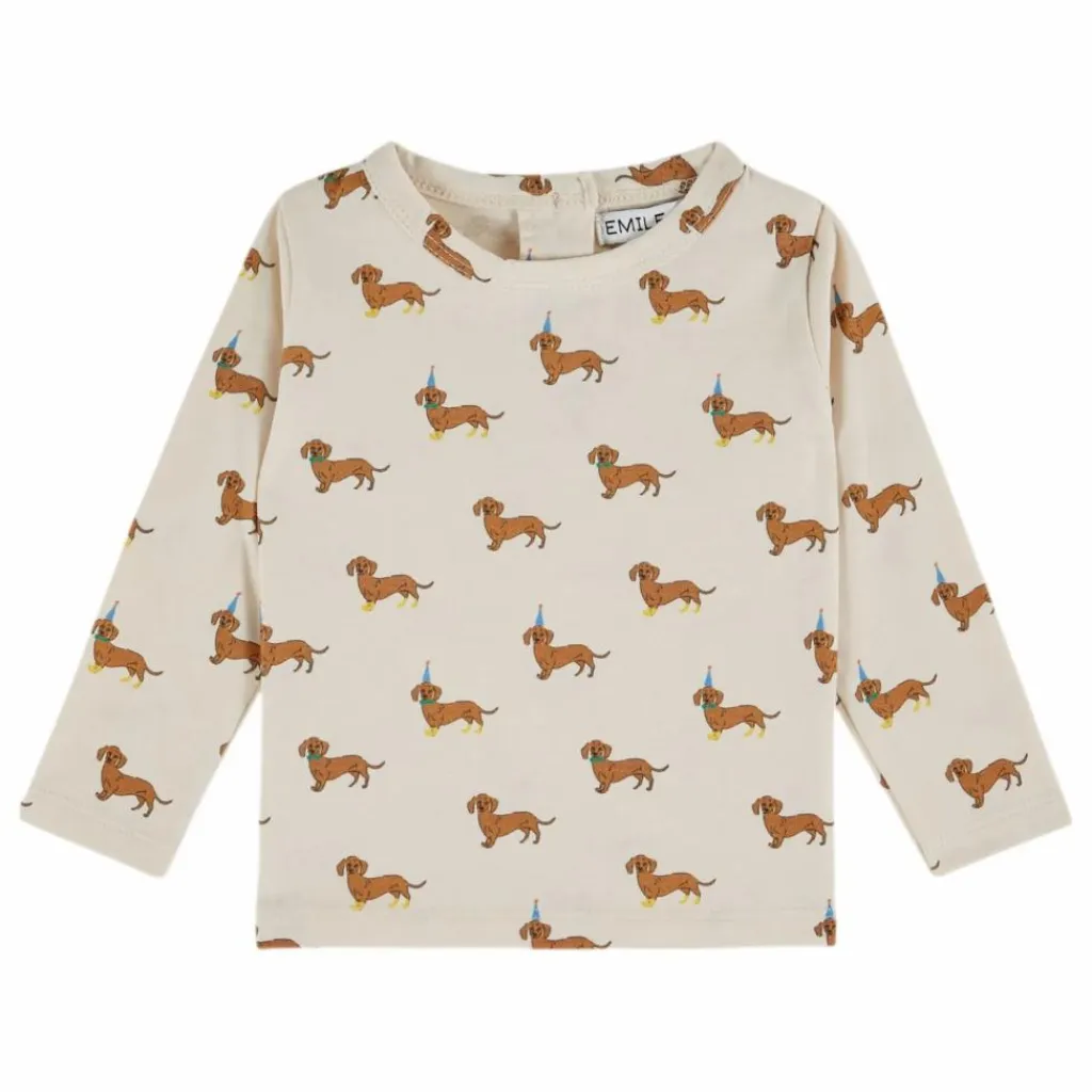 - Tee-shirt en jersey de coton biologique écru imprimé de teckels caramel à bottes jaunes, nœuds papillon verts et chapeaux pointus bleus. C’est la fête chez les teckels !