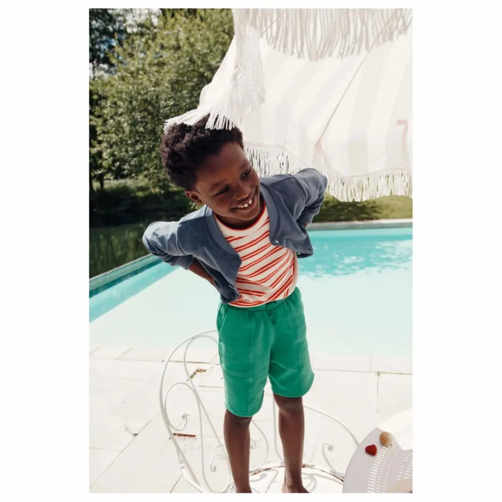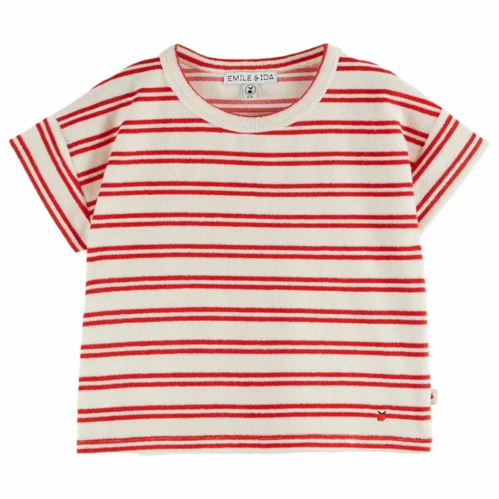 - Tee-shirt en jersey de coton et polyester à rayures blanches sur fond bleu. Pour confectionner ce tee-shirt, nous avons sélectionné du velours éponge tout doux, moelleuse, extensible et confortable, comme nous l’ont dit les bébés et les enfants qui l’ont essayé.