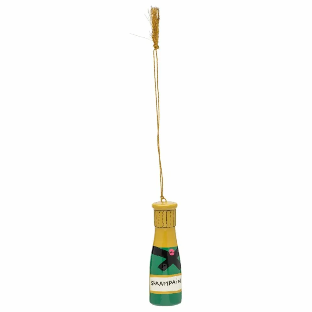 - L’ornement Shaampain est une pièce décorative amusante et vivante, faite à la main, avec une touche éclectique sur une corde dorée. Laissez ce magnifique ornement enchanter votre arbre de Noël.