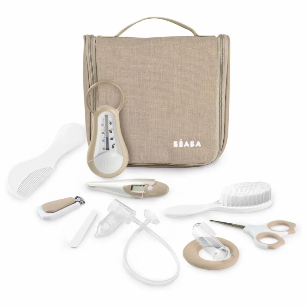 Cette trousse de toilette contient dix accessoires indispensables pour le soin et la toilette de votre bébé : un thermomètre de bain, un thermomètre digital, des ciseaux, un coupe-ongles, une brosse à cheveux, un peigne, un anneau de dentition, un masseur de gencives, un mouche-bébé manuel, et des limes à ongles. Chaque élément a été sélectionné avec soin pour répondre aux besoins quotidiens de votre bébé.