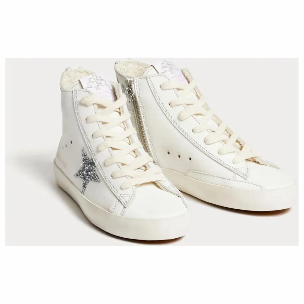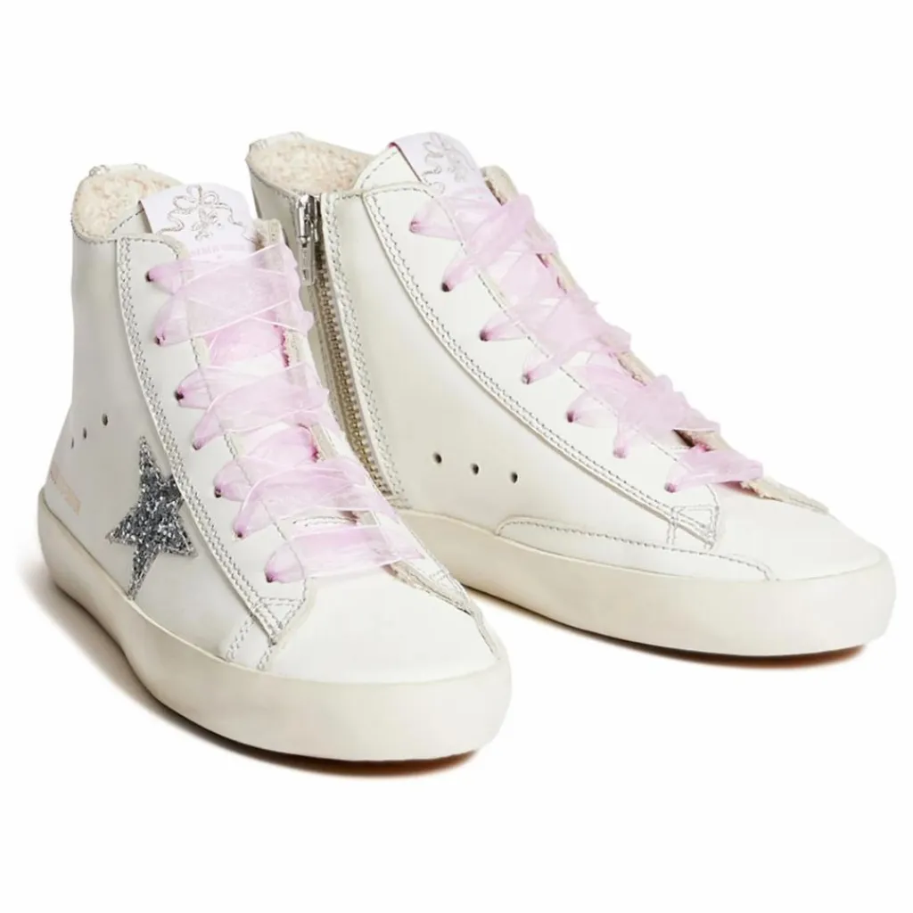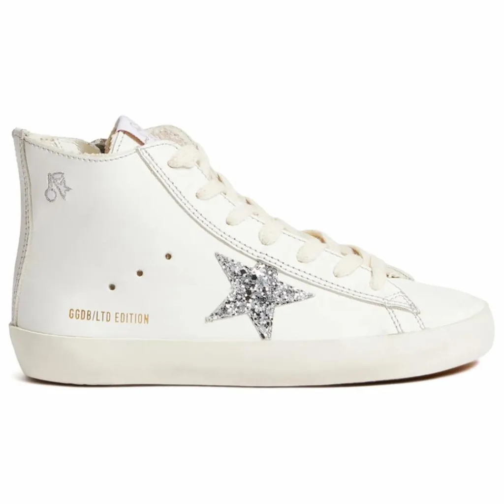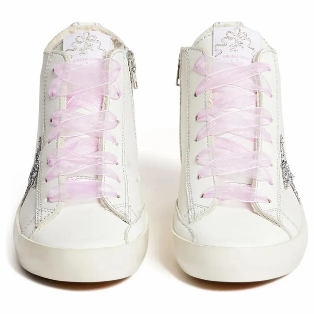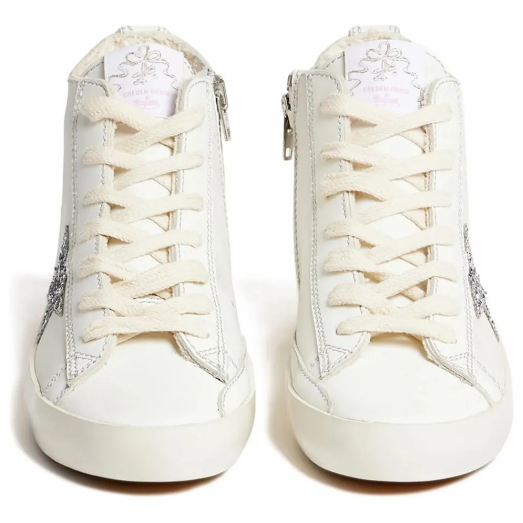 - Issues d’une collaboration Golden Goose x Bonpoint, ces baskets montantes pour filles font partie des indispensables. Facile à associer avec les tenues du quotidien, elles comportent de nombreux détails signature, dont une grande étoile Golden Goose en paillettes métallisées. Pratique, ce modèle possède une double fermeture : un zip sur le côté intérieur et des lacets rubans sur le dessus. Contient du cuirForme montanteDoublure fourréeBroderie Bonpoint sur la languetteCerise Bonpoint sur le haut de tigeDeux jeux de lacets de couleurs différentes
