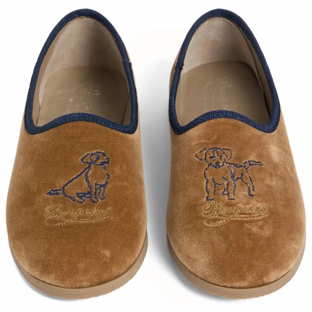 - Confectionnés en velours lisse, ces chaussons Gib se distinguent par leur broderie chien soulignée du logo Bonpoint. Ils sont très agréables à porter grâce à leur semelle intérieure et leur doublure en cuir.Bout rondSemelle plateTour de pied contrastant