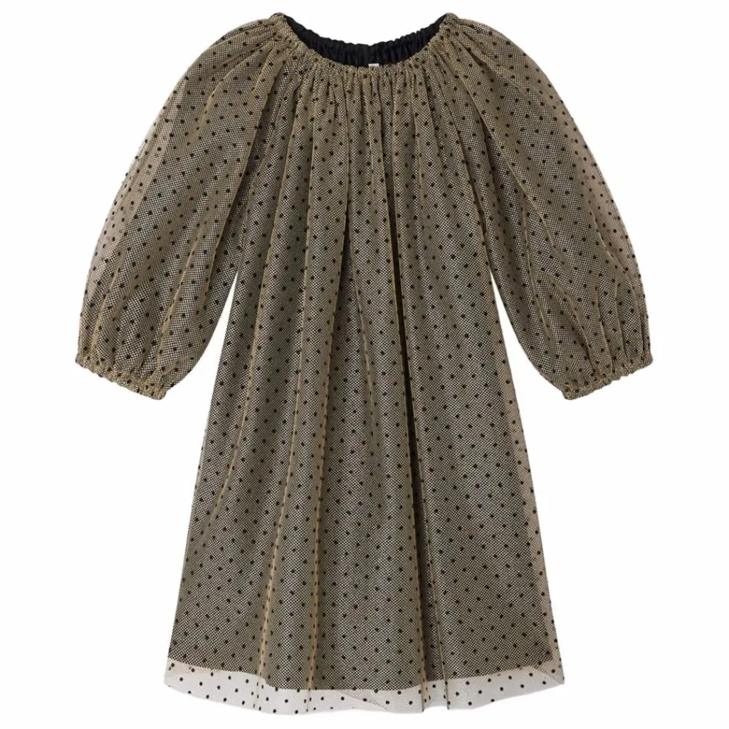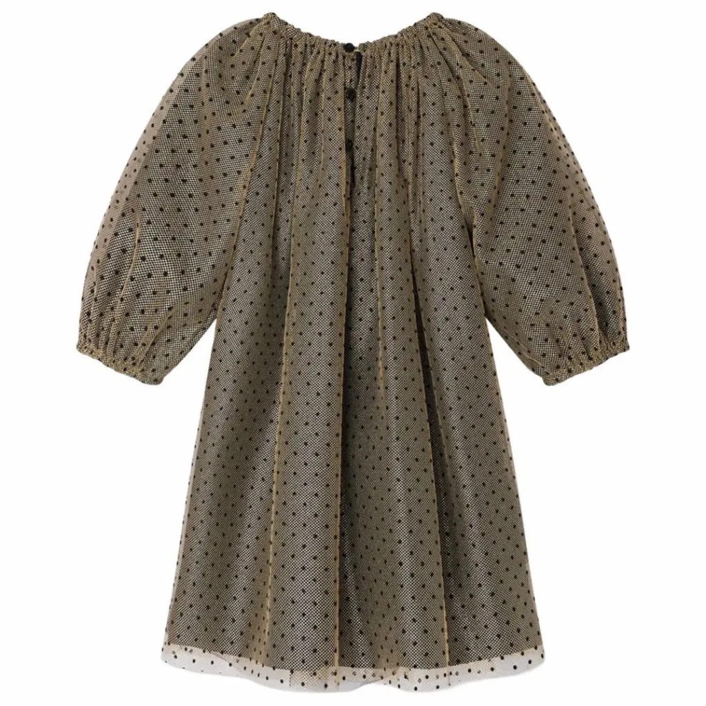 - D’inspiration rétro, cette robe pour fille Juste est confectionnée en tulle à motif pois. Sa coupe évasée et son encolure élastiquée agrémentée d’un élégant jeu de fronces contribuent à son charme et la rendent très agréable à porter. Ce modèle se dote de manches 3/4 à bout élastiqué. Il s’ouvre au dos à l’aide de boutons bijoux.En tulle floqué à motif poisCoupe évaséeDoubléeManches 3/4 à bout élastiquéCol rond élastiqué