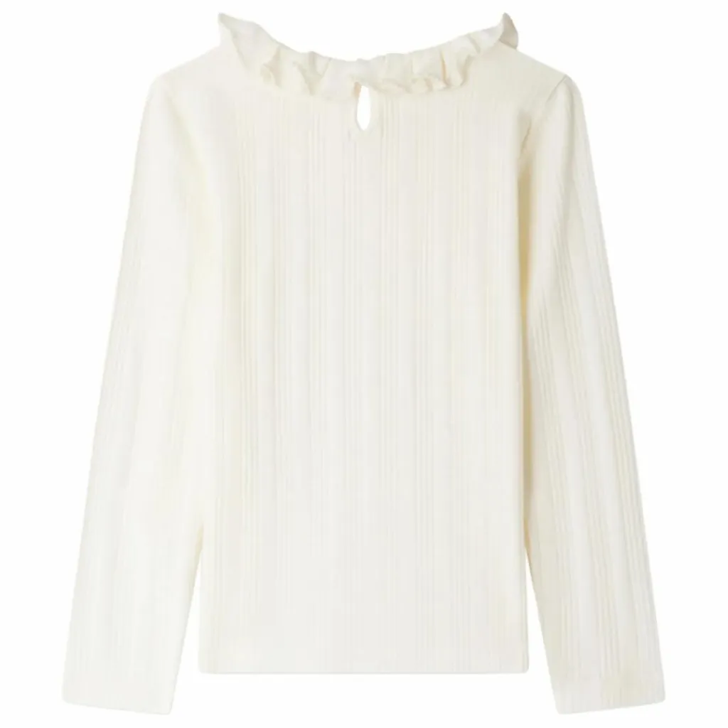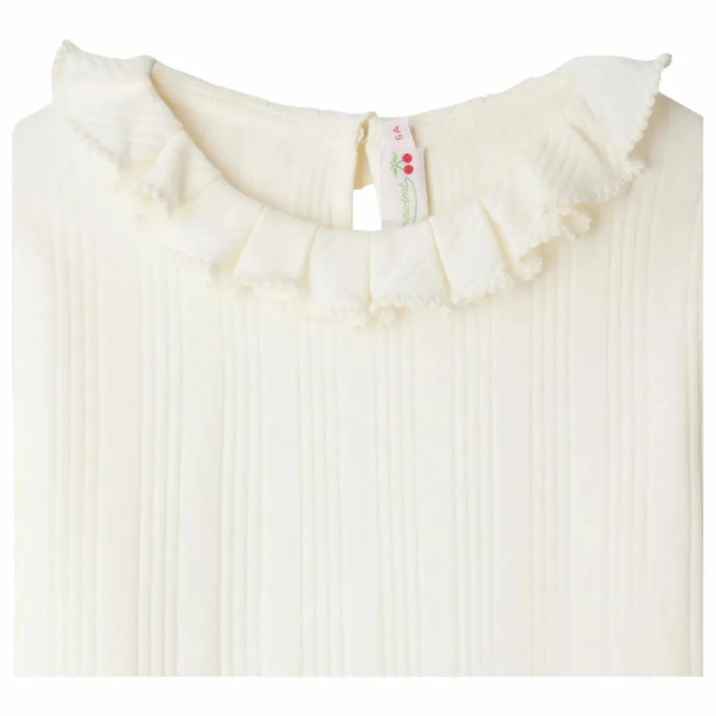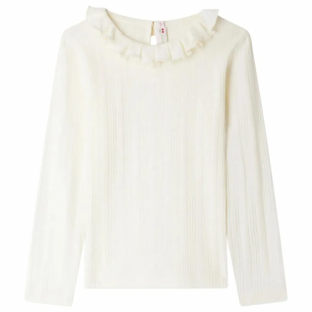 - Le t-shirt Bess pour fille mise sur l’élégance avec son grand col à volant plissé. Confectionné en coton issu de l’agriculture biologique, il se dote d’une découpe goutte d’eau boutonnée au dos. En coton biologiqueManches longues Maille à côtes