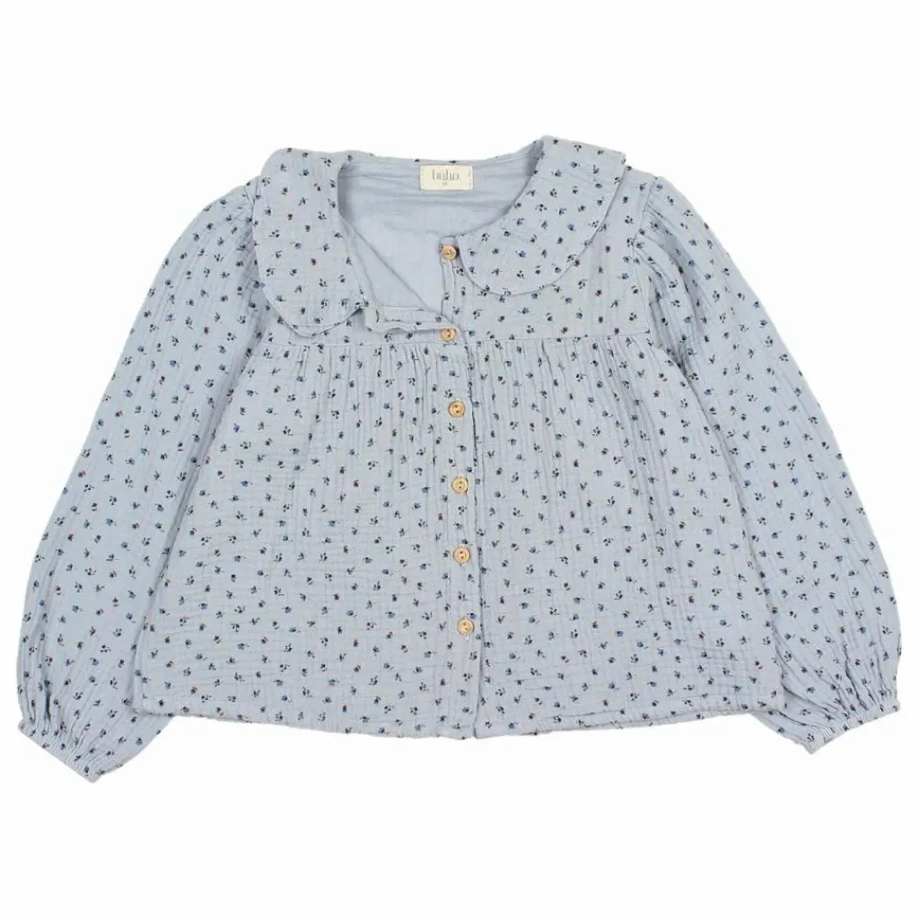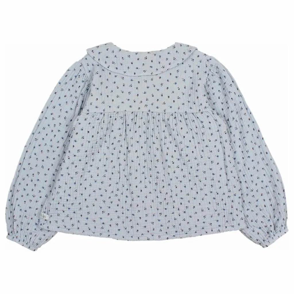 - Blouse en mousseline imprimée « Automne ». Col bébé. Manches longues bouffantes. Poignets élastiques. Fermeture par boutons en bois sur le devant.