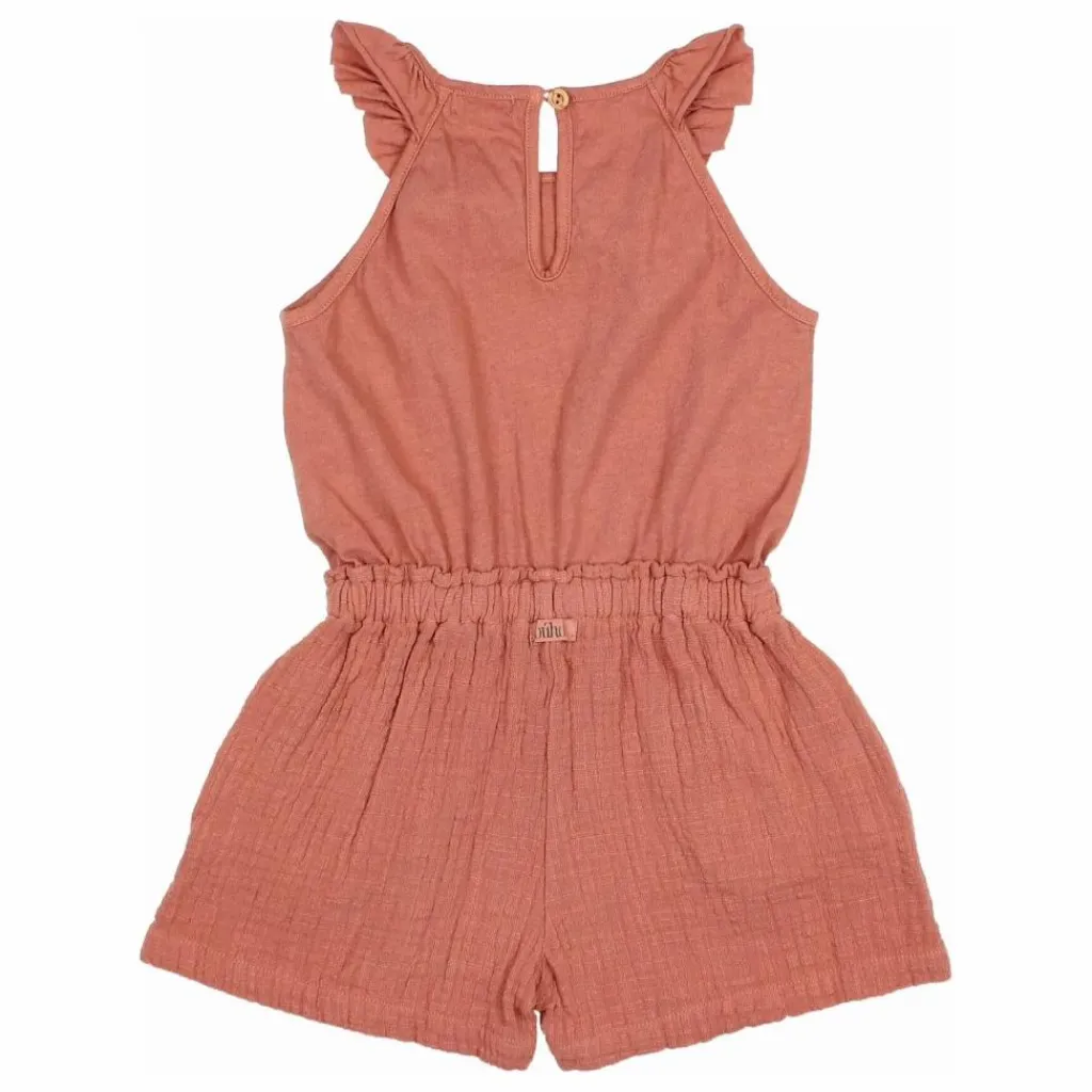 - Combinaison courte combinée. Haut en jersey de coton et lin. Encolure ronde avec volant. Fermeture en goutte d’eau avec bouton au dos. Short en mousseline. Taille élastiquée avec dentelle décorative. Poches sur les coutures latérales.
