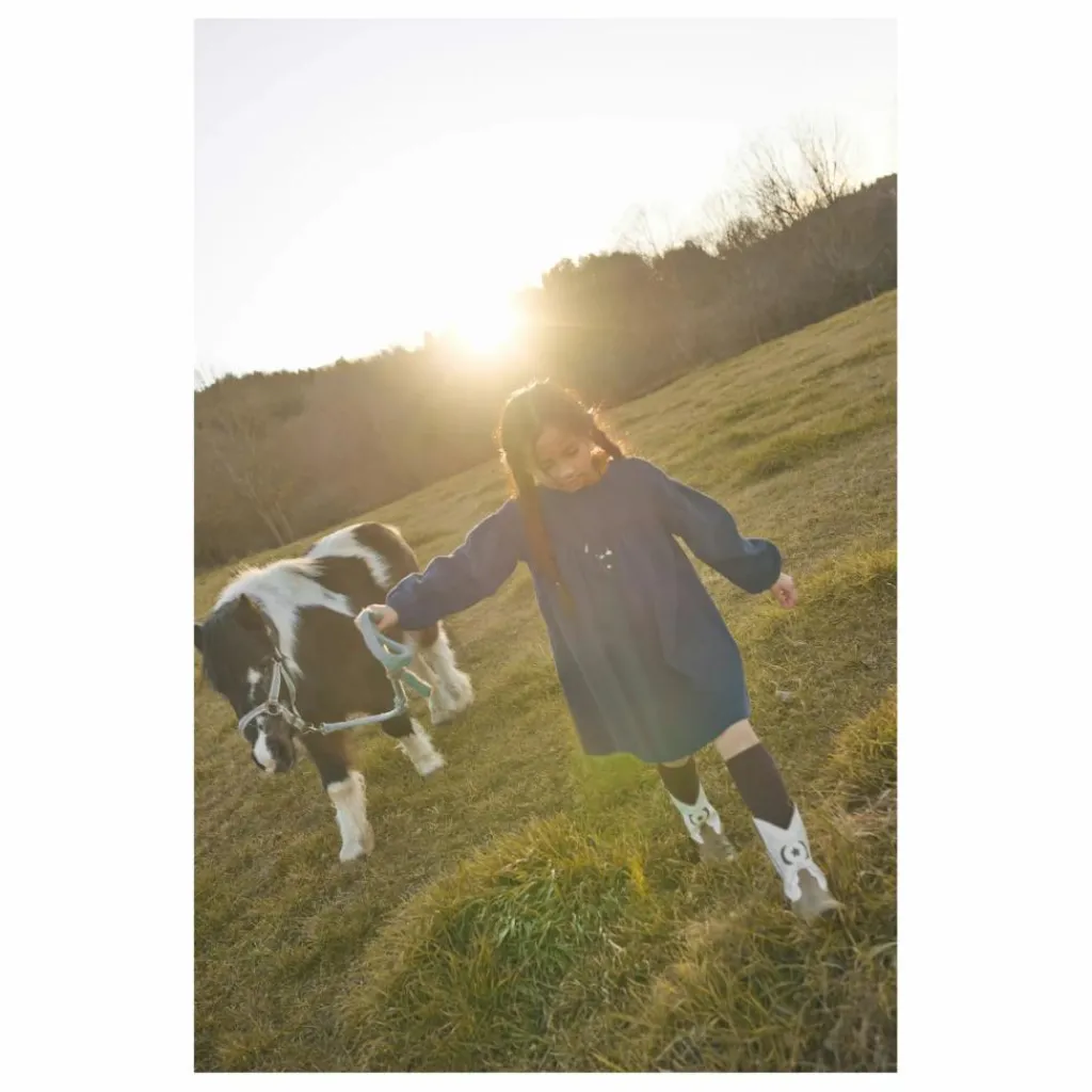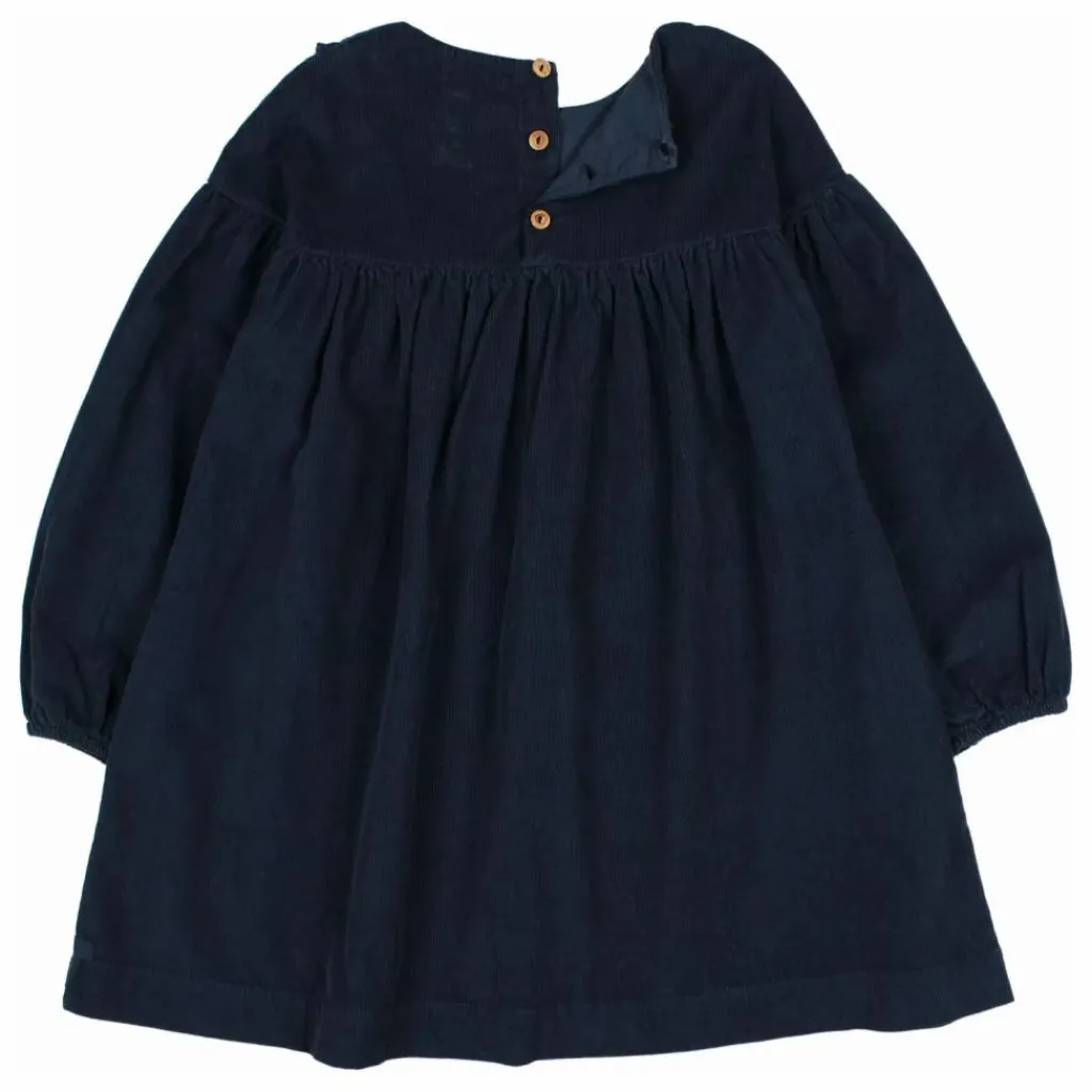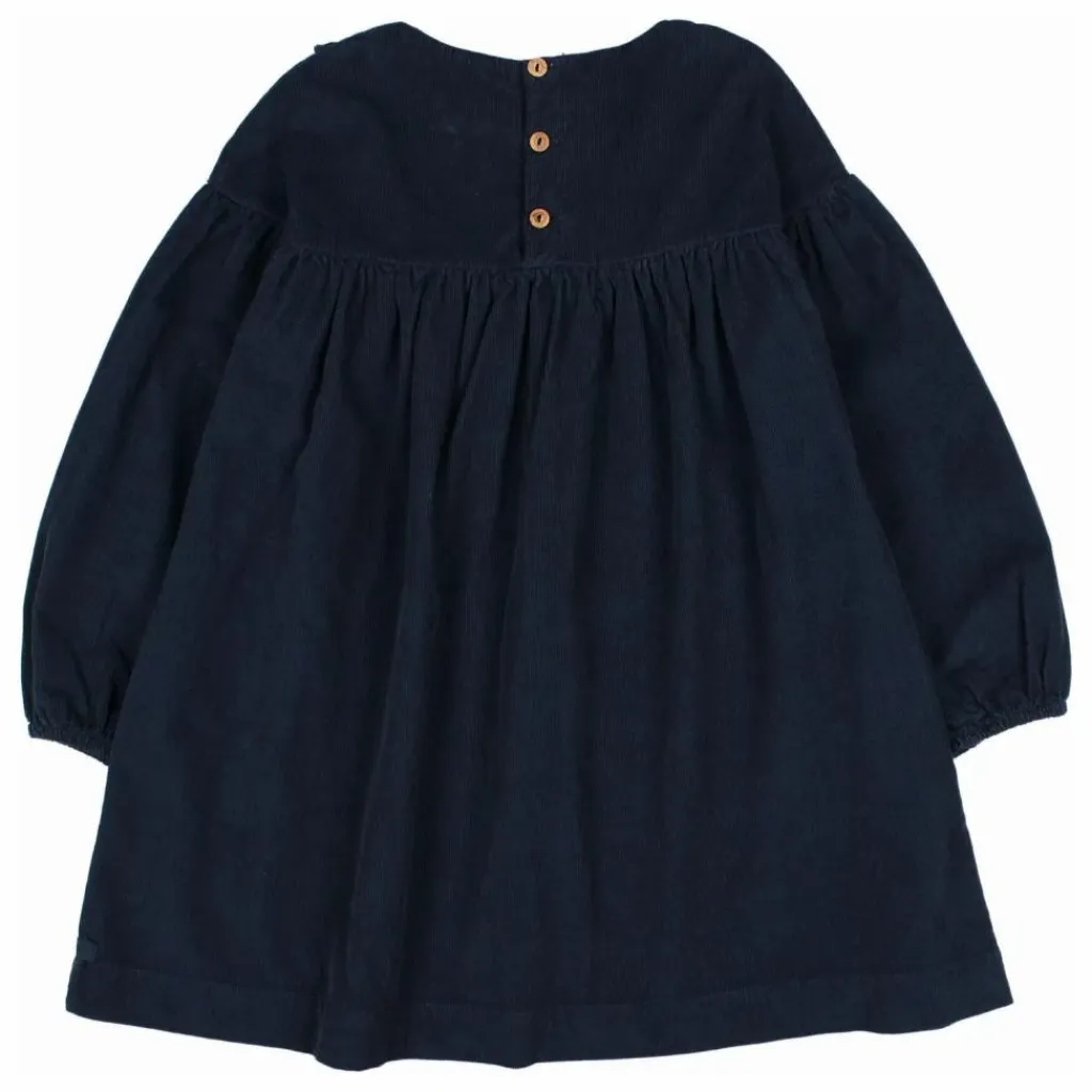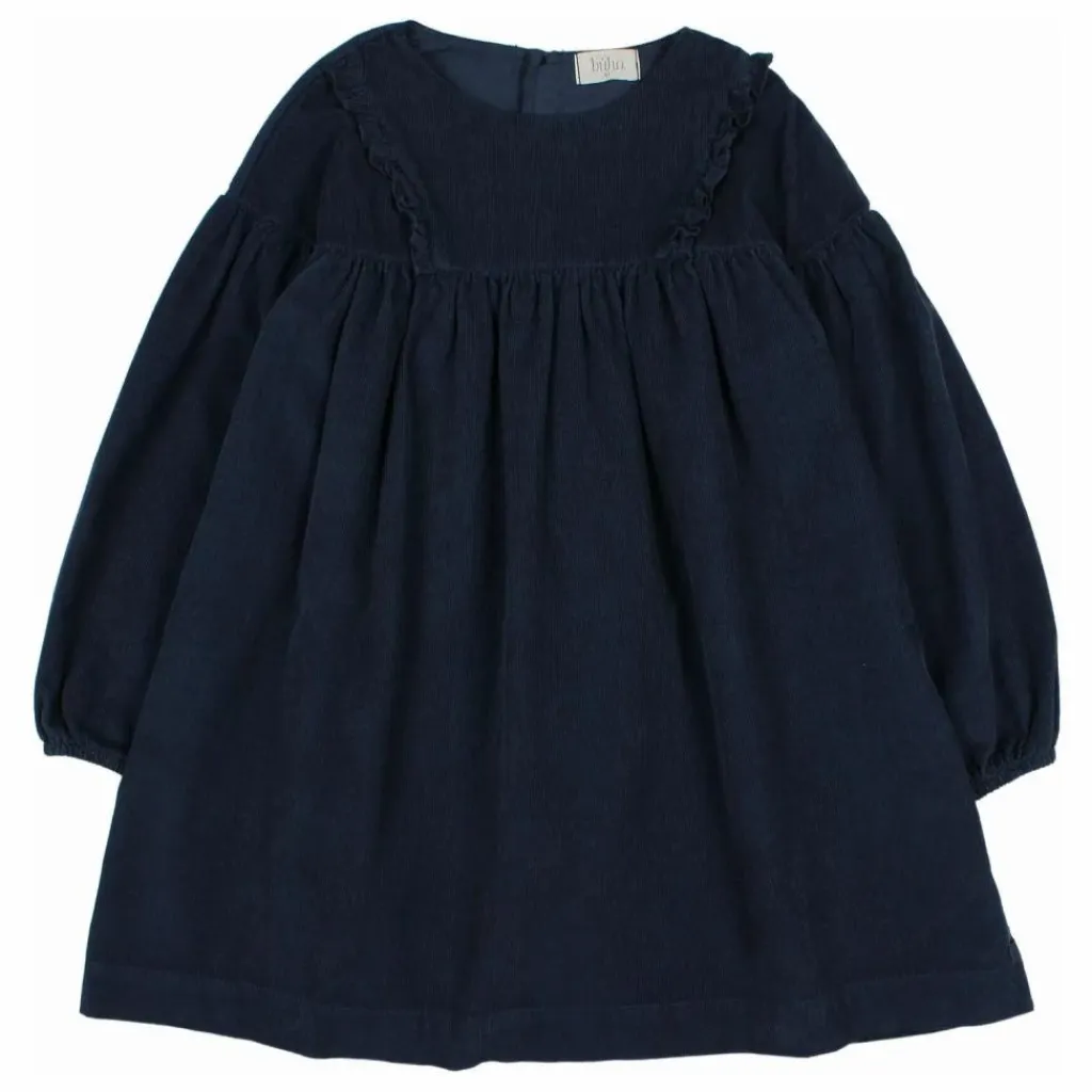 - Robe en micro velours côtelé. Manches longues bouffantes. Encolure ronde fermée par un bouton au dos. Volants sur l’empiècement. Jupe froncée.