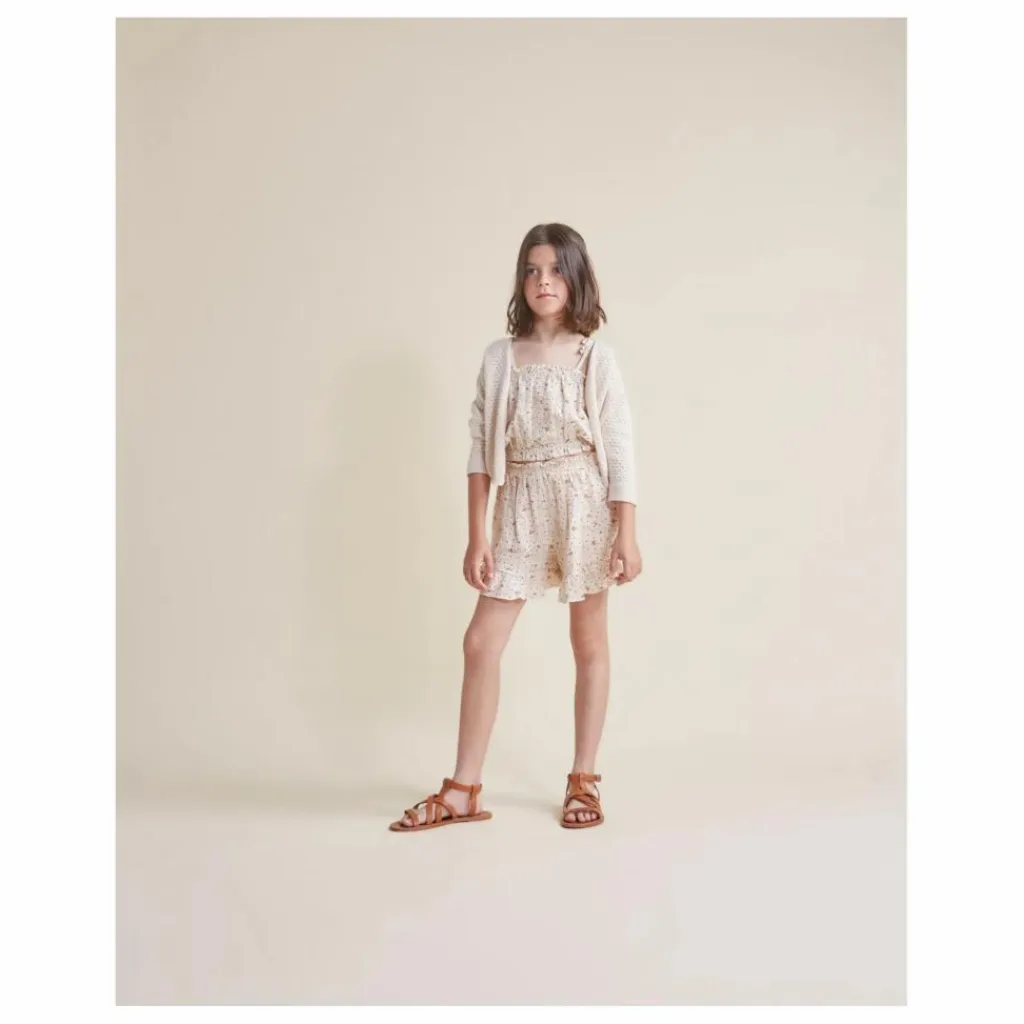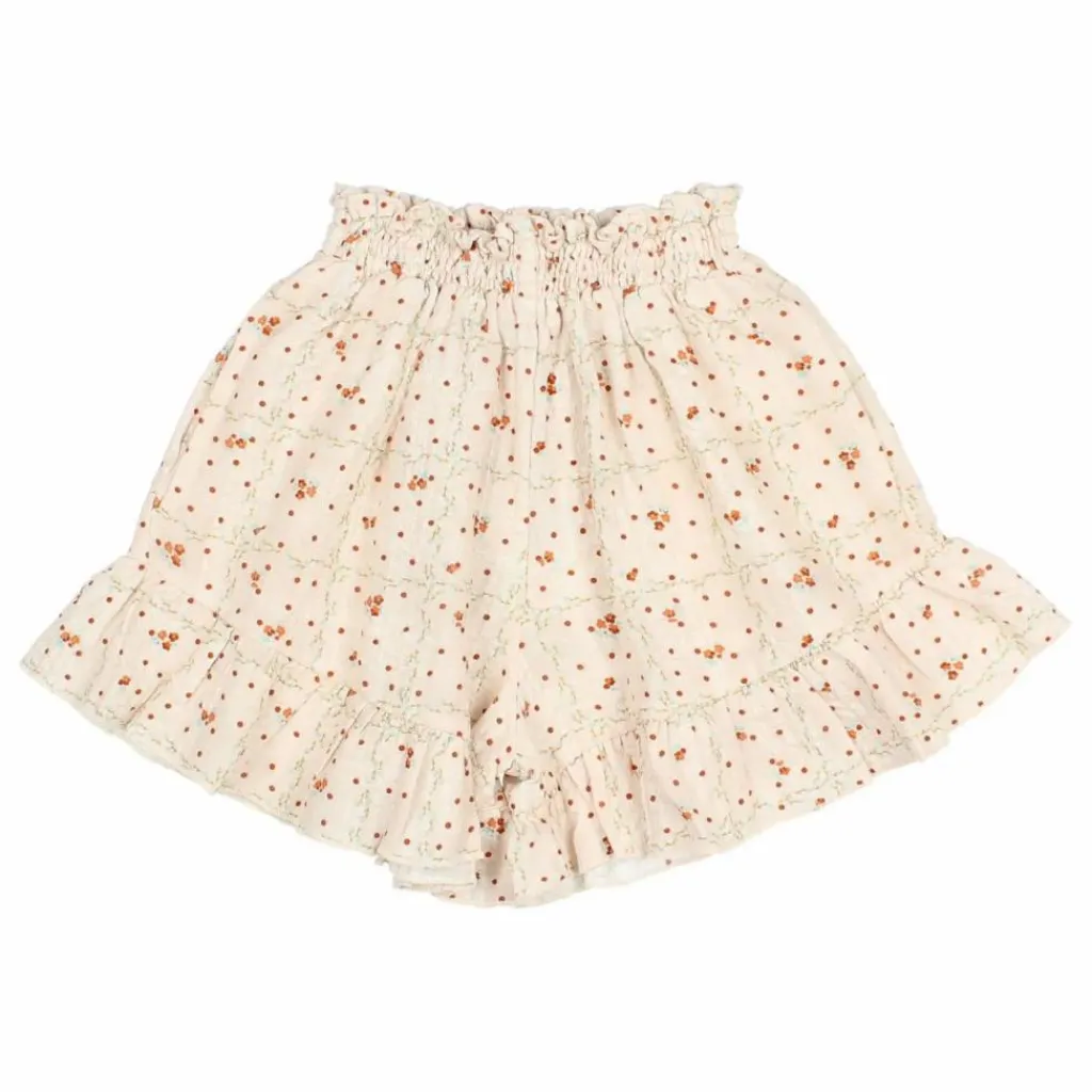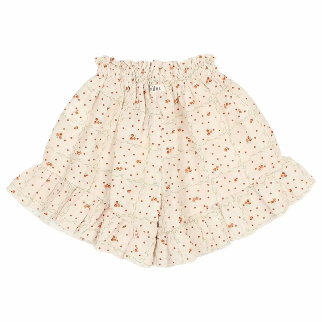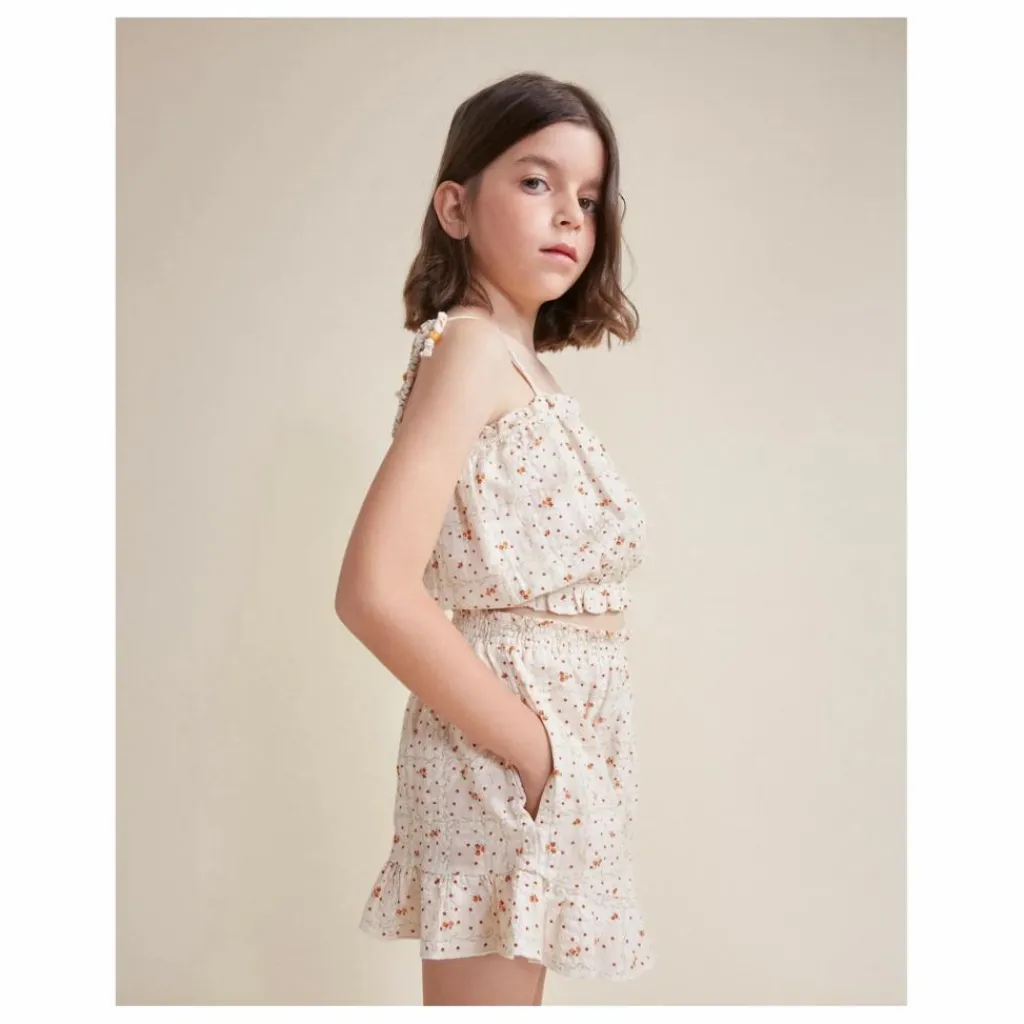 - Short avec imprimé jardin. Taille élastiquée. Ourlet large avec volants. Deux poches dans les coutures latérales.