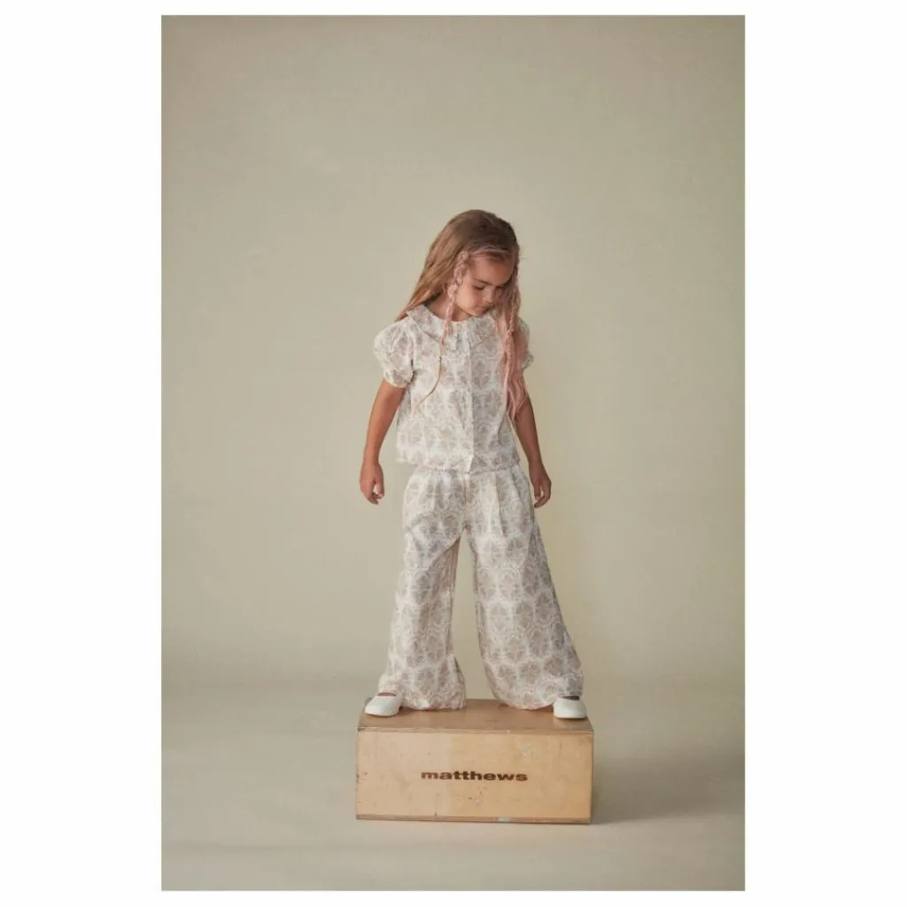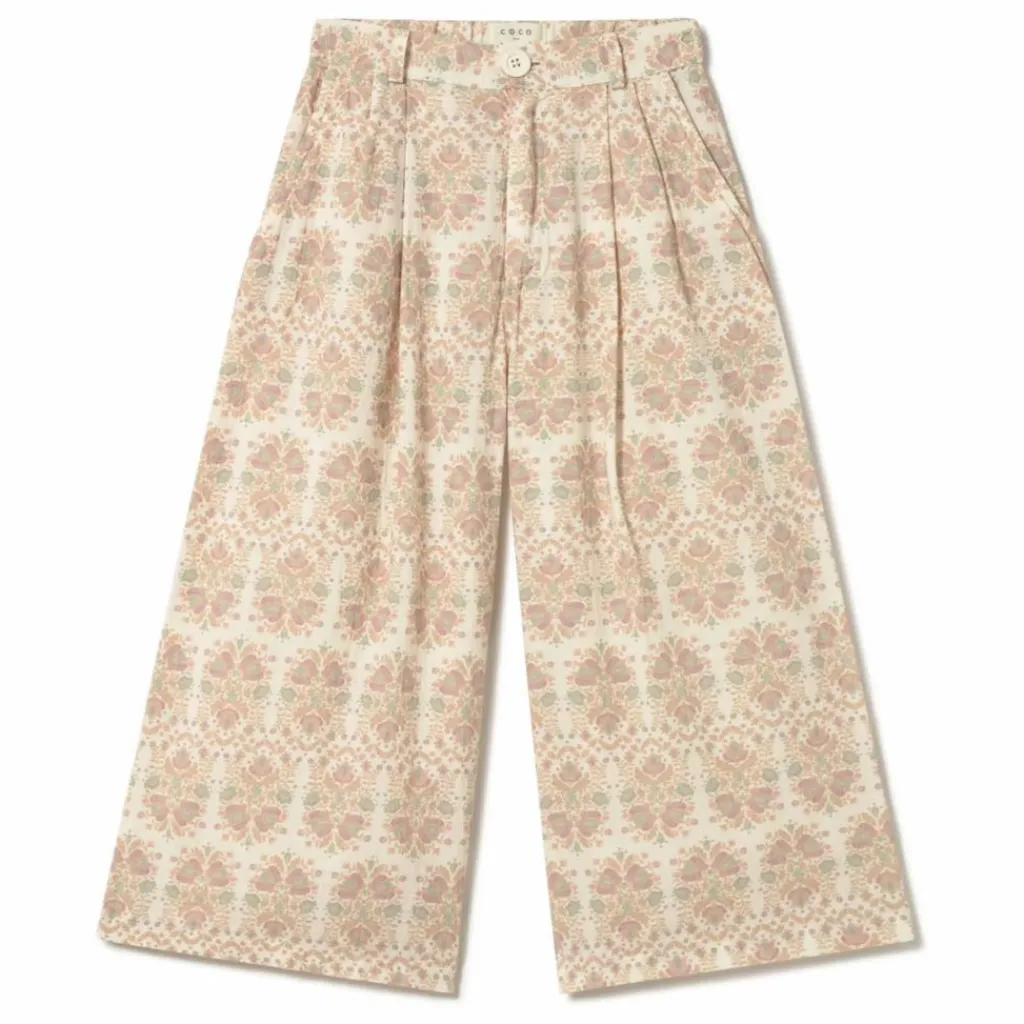 - Pantalon large en papier peint floral, plis sur le devant et poches latérales.
