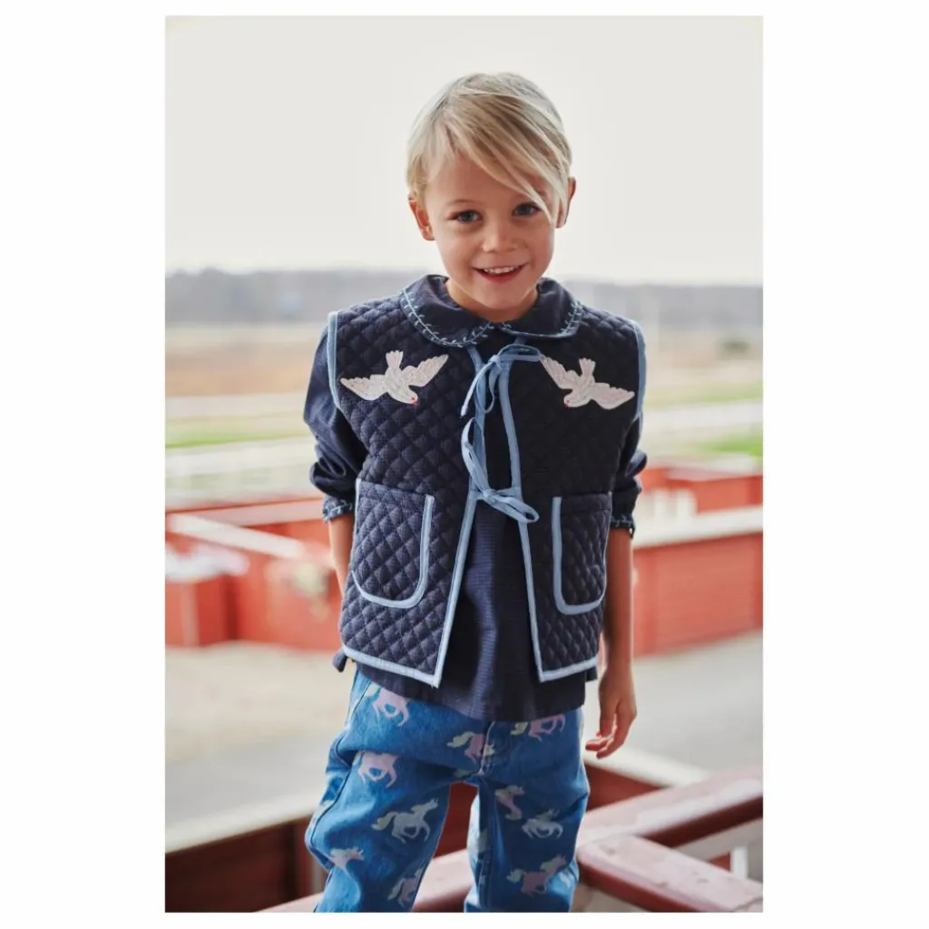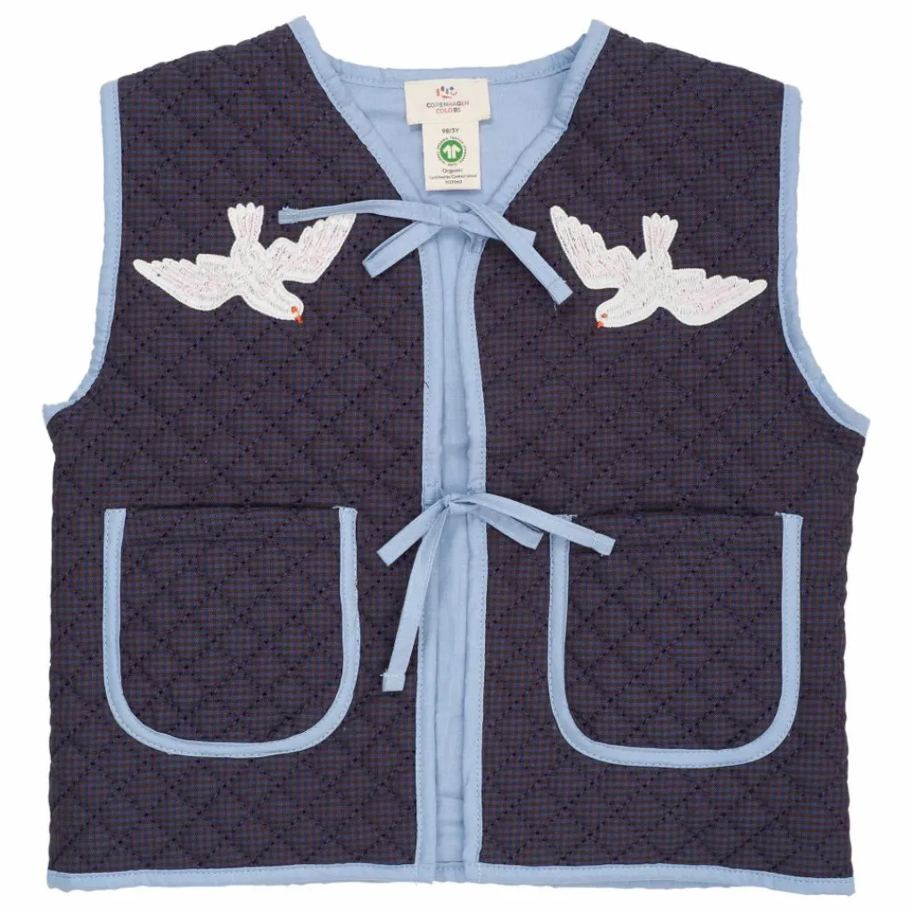 - Ce gilet matelassé est orné de deux colombes sur la poitrine et de deux poches de chaque côté. Le gilet matelassé est fabriqué en 100 % coton biologique.