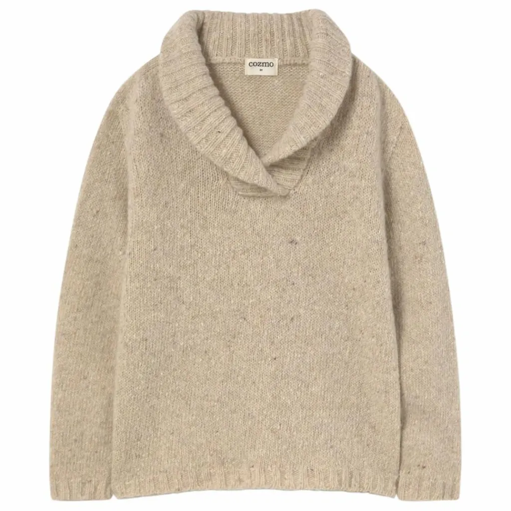 - Pull en tricot doux, moelleux et chaud. Col châle. Côtes au col, aux poignets et à l’ourlet. Subtilement moucheté.