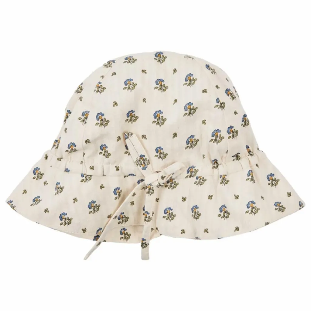 - Chapeau en coton blanc cassé, imprimé en all-over de fleurettes bleues. Avec son large rebord, il offre une protection optimale pour le visage et le cou contre les rayons du soleil.