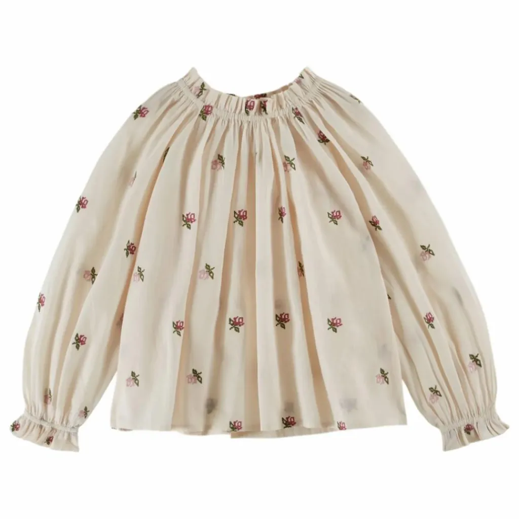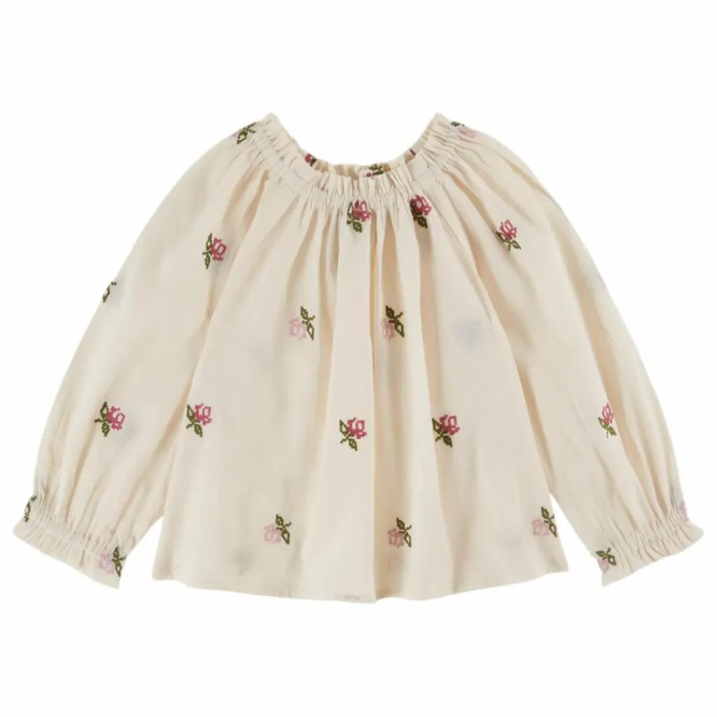 - Blouse en coton écru parsemé de fleurs roses et vertes brodées au point de croix.