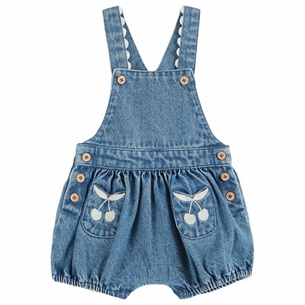 Des surpiqûres viennent souligner et renforcer les deux mini-poches plaquées, brodées de cerises blanches, ajoutant une touche de charme. Comme sur une salopette, une fente équipée de boutons en bois sur les côtés permet d’enfiler le combibloomer facilement.