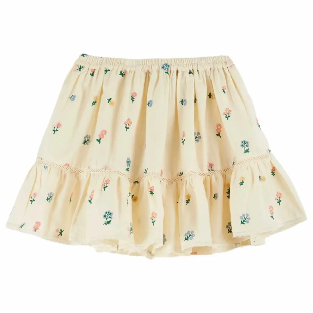 - Jupe en coton jaune pastel, brodée de fleurs jaunes, bleues et roses en all-over. Montée sur une ceinture élastiquée, cette jupe s’adapte à tous les tours de taille ! En bas, un insert de dentelle soutient un volant froncé, ce qui augmente l’ampleur de la jupe. Pour finir en beauté, un liseré de dentelle borde l’ourlet.