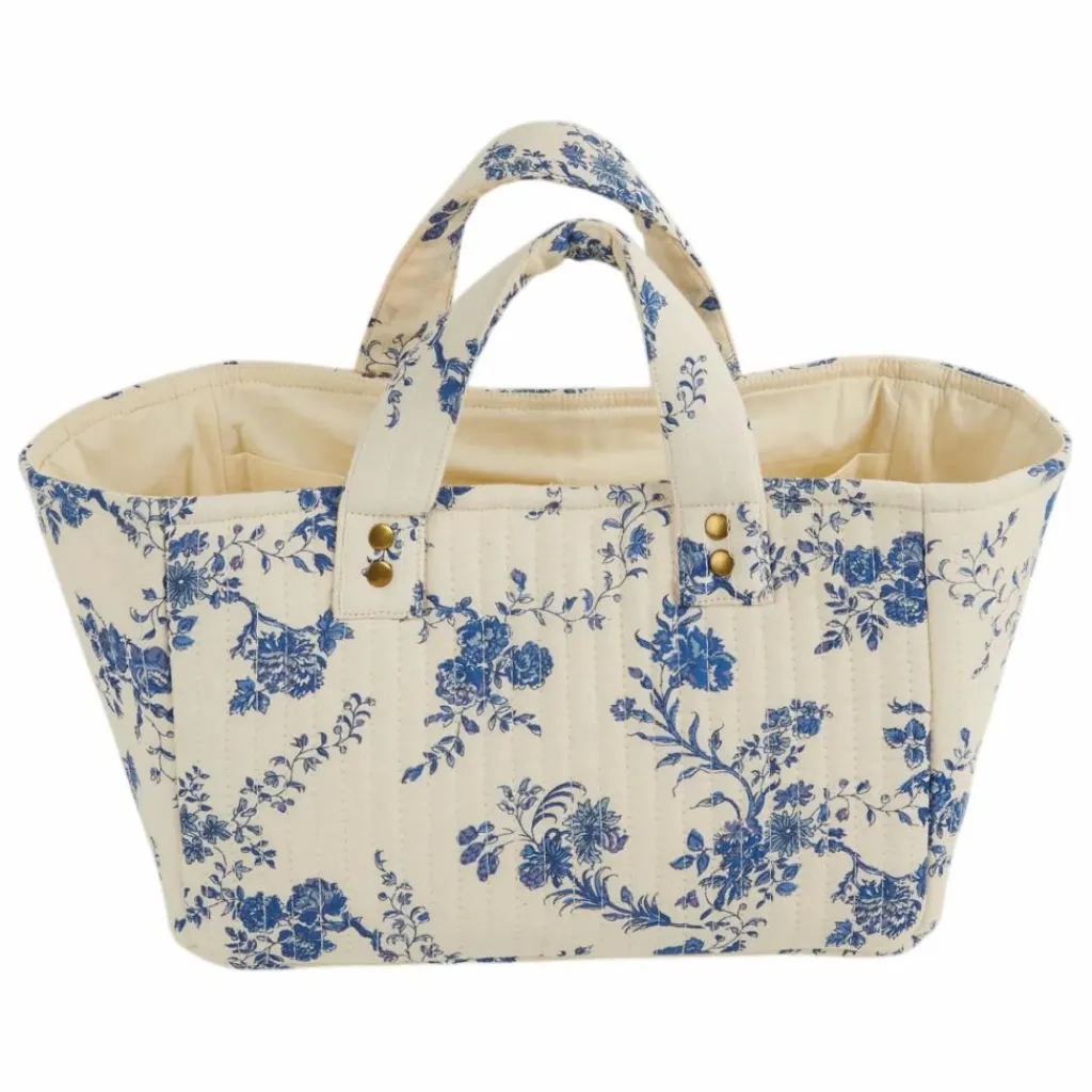 - Panier de rangement écru en coton molletonnée, parsemée de fleurs bleues.