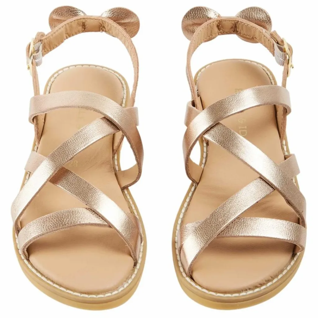 - Sandales en cuir caramel. Quatre lanières entremêlées maintiennent les pieds confortablement fixés à une semelle rembourrée pour un confort optimal, tandis qu’une lanière ajustée derrière la cheville assure un bon maintien, empêchant les sandales de glisser. La fermeture s’effectue sur le côté grâce à une élégante boucle dorée. Ces sandales sont entièrement doublées de cuir lisse, offrant une finition soignée et agréable au porter.