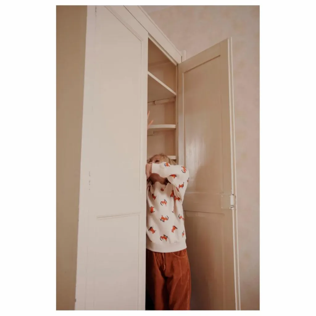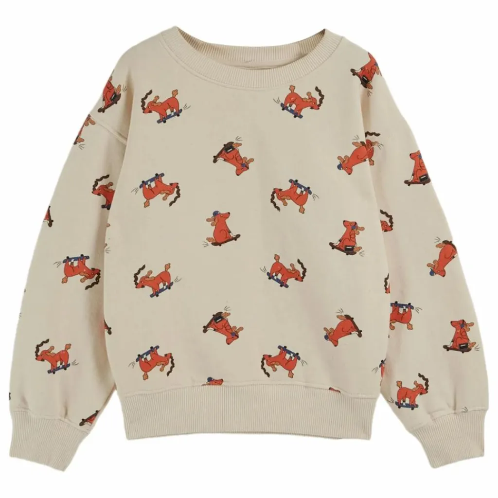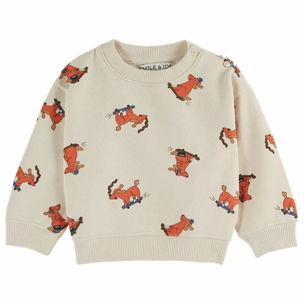 - Sweatshirt en jersey de coton biologique molletonné et gratté écru sur lequel s’amusent des chiens facétieux. Ils font du skateboard assis, debout ou couchés, font des pirouettes ou se sauvent après avoir dérobé un chapelet de saucisses. Seraient-ils aussi coquins que vos enfants ?