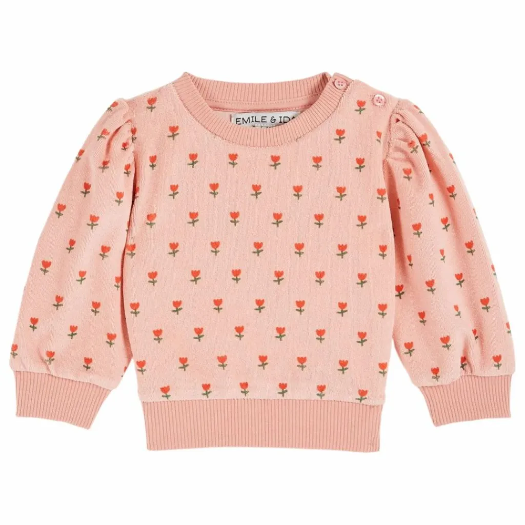 - Sweatshirt en jersey éponge de coton et de polyester rose, imprimé de tulipes aux pétales rouge vermillon, aussi bien alignées que dans un jardin à la française. Nos stylistes seraient-elles des émules d’André Le Nôtre ?
