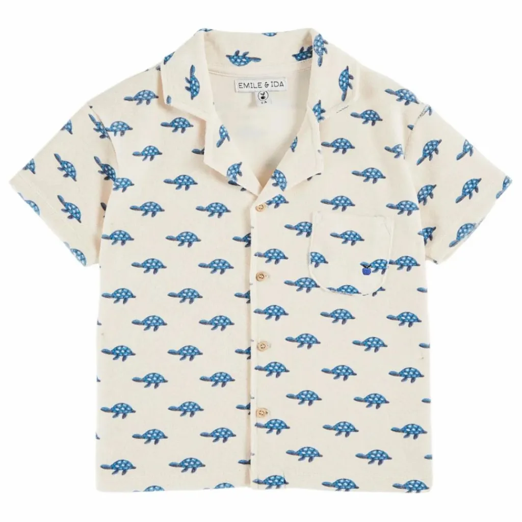 - Chemisette à manches courtes en jersey éponge de coton et polyester blanc cassé, imprimée de tortues bleues. Elle possède un petit col tailleur, deux manches courtes, ainsi qu’une poche poitrine ornée d’une petite pomme noire brodée. Les boutons en bois ferment la chemisette sur toute la hauteur, offrant confort et praticité.