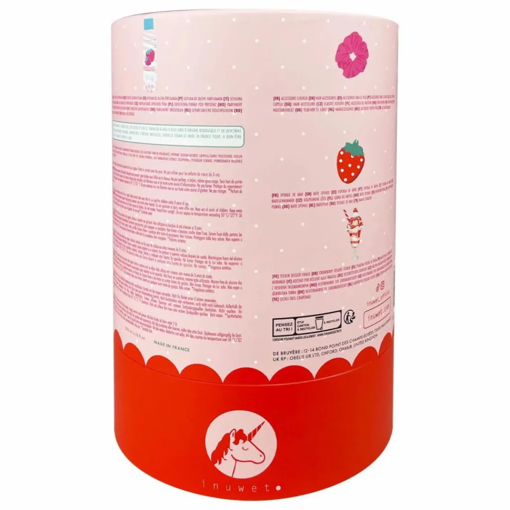 - 1 mousse de douche fraise, une éponge en forme de fraise, un chouhou rose et un sticker