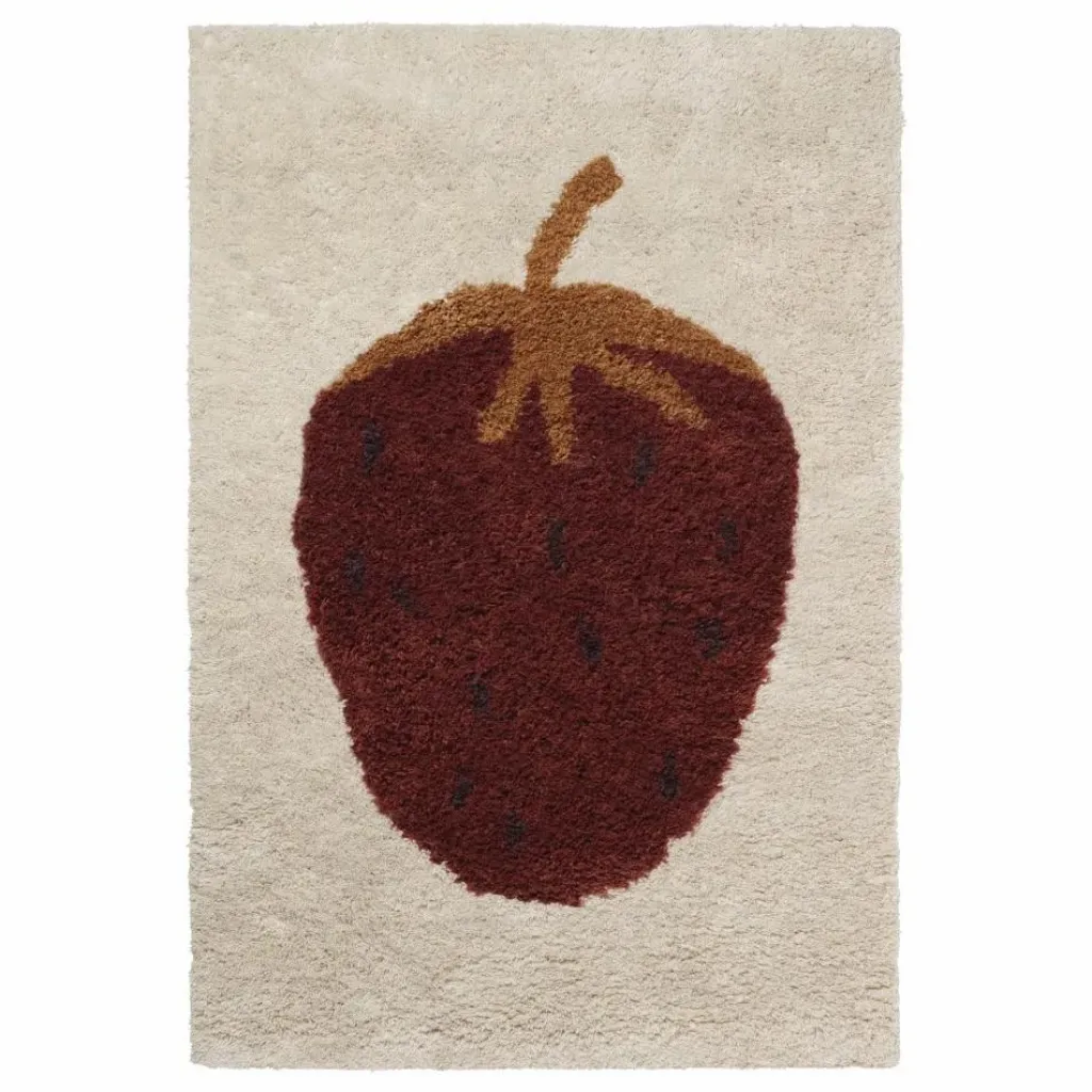 Ce tapis fraise en laine de Nouvelle-Zélande est tufté à la main.