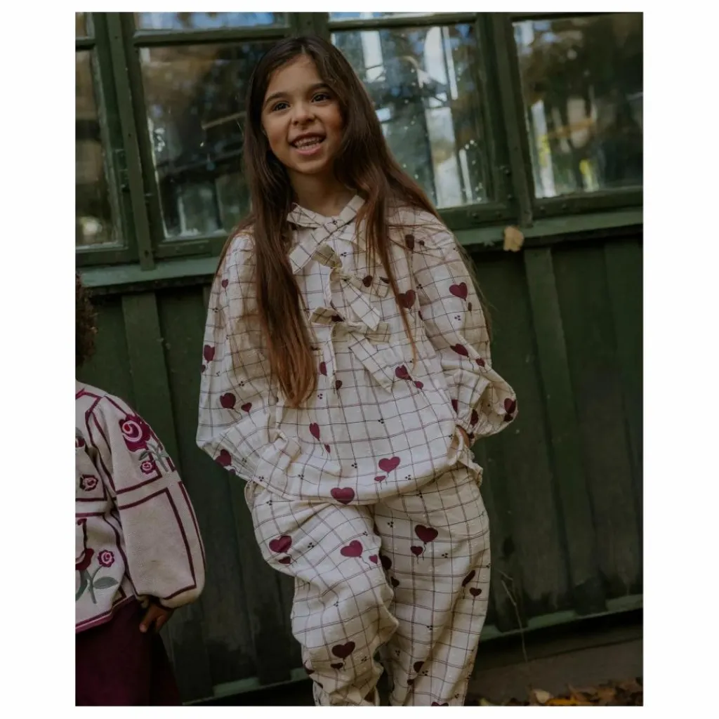 - Chemisier léger à manches longues en coton doux, imprimé de carreaux et de ballons en forme de cœur. Le chemisier a des manches volumineuses, des fronces à l’épaule et un élastique aux poignets. Une couture à la taille avec une jupe donne du volume à la blouse. L’encolure est ronde et des boutons recouverts de tissu sont placés sur l’épaule pour faciliter l’enfilage et le désenfilage. Le chemisier est décoré de nœuds sur le devant, ce qui lui confère une allure féminine et douce.