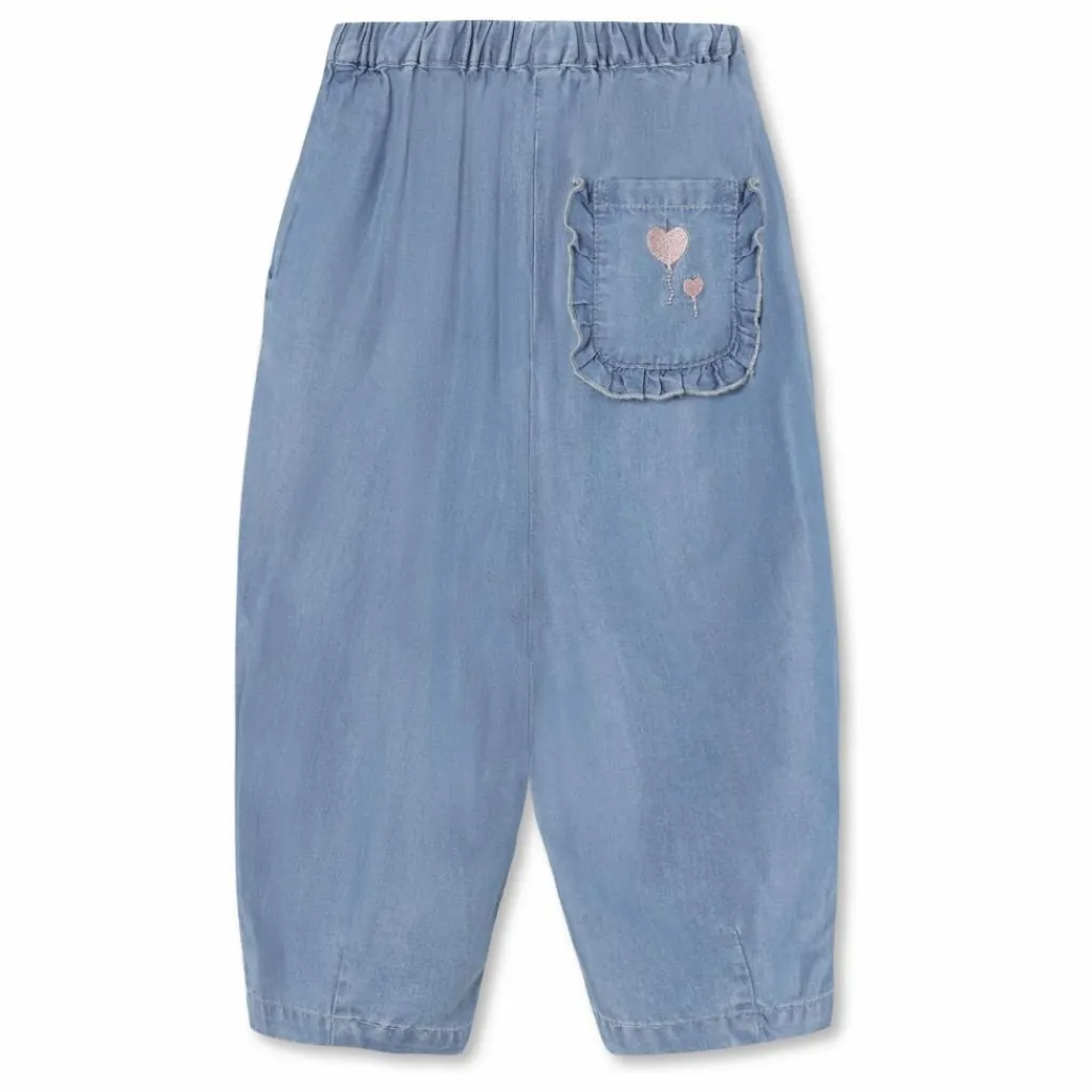 - Pantalon souple en maille ample. Le pantalon a des poches inclinées sur le devant avec des volants. Au dos, il a une seule poche avec des volants le long du bord et une broderie avec un ballon en forme de cœur.