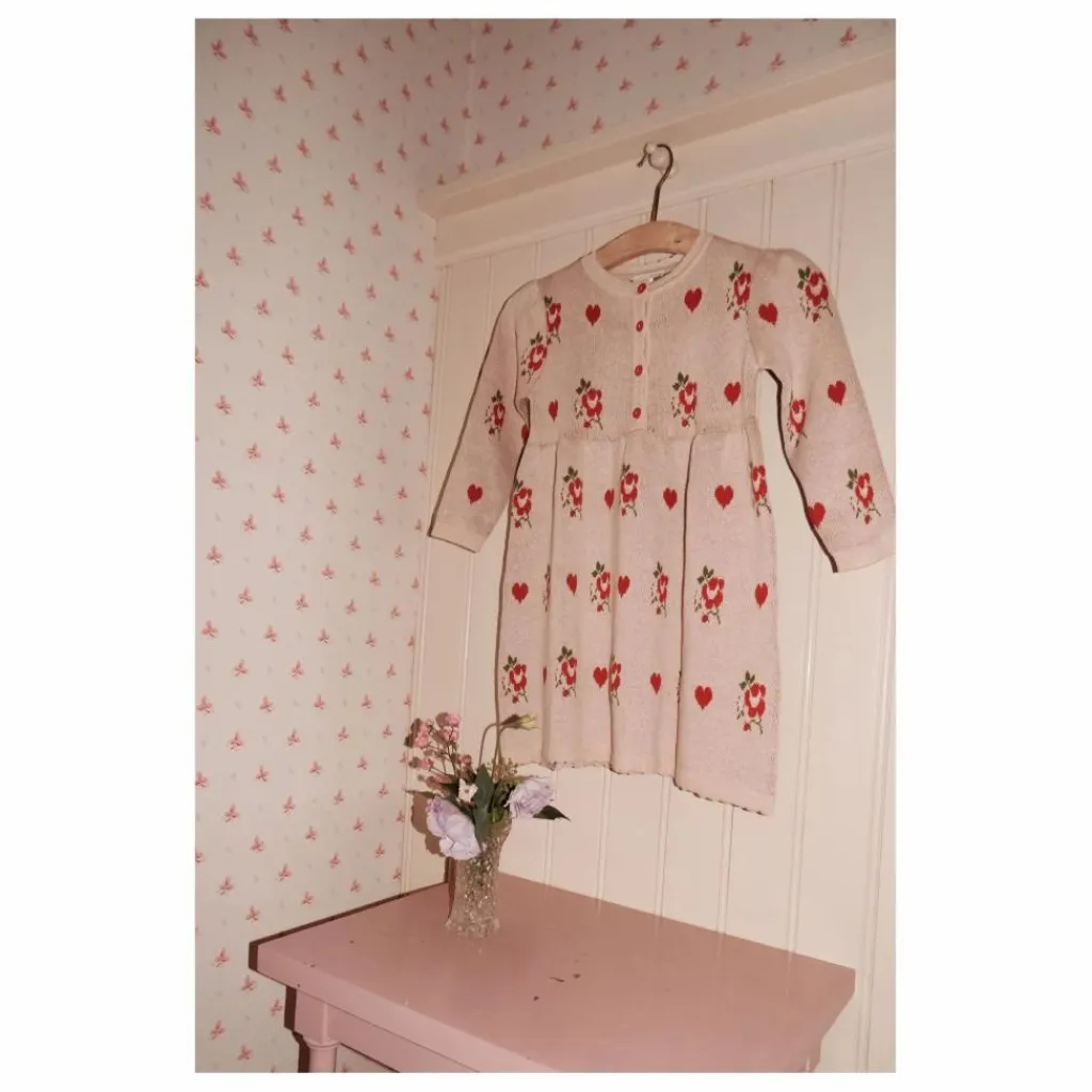 - La robe Amelia est fabriquée en coton tricoté lourd. Elle apporte confort et chaleur, avec un adorable motif de roses et de cœurs. Elle présente un col rond avec des détails en pointelle et se ferme sur le devant à l’aide de boutons rouges.