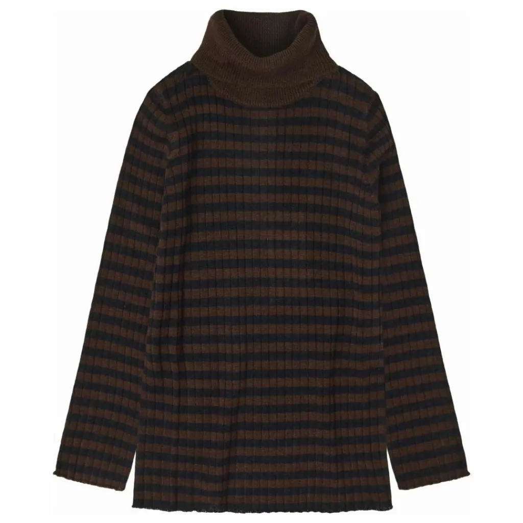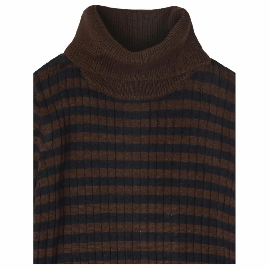 - Tricoté en laine mérinos extra-fine, ce pull présente des manches longues et un col roulé contrasté. Il est confectionnée dans une structure en côtes rayées et conçue avec une coupe droite et ajustée, fini avec des bordures de couleur contrastée au niveau des ourlets des manches. Notre laine mérinos est certifiée BLUESIGN® et RWS, elle est exempte de produits chimiques nocifs et provient de moutons non mulets.