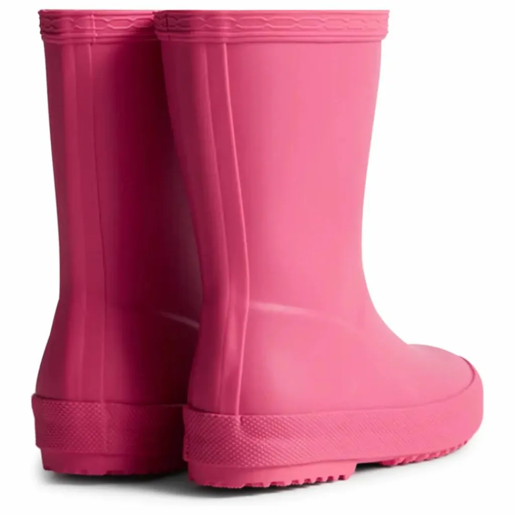 - La Kids First Classic Wellington Boot a été mise à jour avec une nouvelle semelle améliorée. Parfaites pour éclabousser les flaques d’eau, ces bottes noires pour enfants sont fabriquées à la main en caoutchouc naturel, entièrement imperméables et dotées d’une semelle texturée/zigzag plus profonde spécialement conçue pour réduire les risques de glissade. Avec une doublure en polyester 100 % recyclé et un bout arrondi qui permet aux petits pieds de bouger, elles assurent un confort total pour chaque aventure. Nous recommandons que toutes les bottes Hunter soient portées avec des chaussettes pour protéger la peau du porteur du contact avec le caoutchouc.